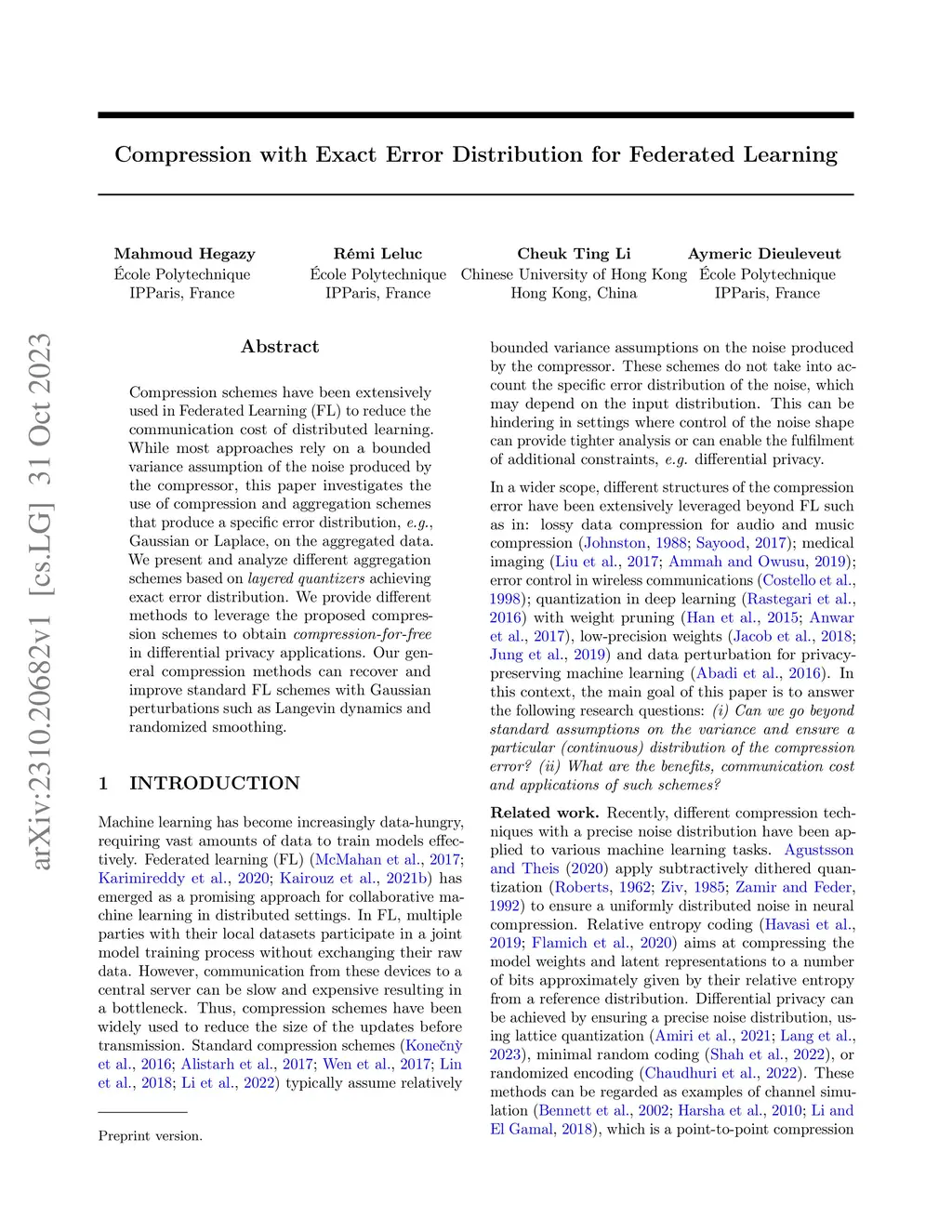 Compression schemes have been extensively used in Federated Learning (FL) to reduce the communication cost of distributed learning. While most approaches rely on a bounded variance assumption of the noise produced by the compressor, this paper investigates the use of compression and aggregation schemes that produce a specific error distribution, e.g., Gaussian or Laplace, on the aggregated data. We present and analyze different aggregation schemes based on layered quantizers achieving exact error distribution. We provide different methods to leverage the proposed compression schemes to obtain compression-for-free in differential privacy applications. Our general compression methods can recover and improve standard FL schemes with Gaussian perturbations such as Langevin dynamics and randomized smoothing.