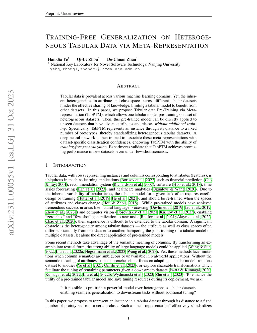 Pre-training is prevalent in deep learning for vision and text data, leveraging knowledge from other datasets to enhance downstream tasks. However, for tabular data, the inherent heterogeneity in attribute and label spaces across datasets complicates the learning of shareable knowledge. We propose Tabular data Pre-Training via Meta-representation (TabPTM), aiming to pre-train a general tabular model over diverse datasets. The core idea is to embed data instances into a shared feature space, where each instance is represented by its distance to a fixed number of nearest neighbors and their labels. This ''meta-representation'' transforms heterogeneous tasks into homogeneous local prediction problems, enabling the model to infer labels (or scores for each label) based on neighborhood information. As a result, the pre-trained TabPTM can be applied directly to new datasets, regardless of their diverse attributes and labels, without further fine-tuning. Extensive experiments on 101 datasets confirm TabPTM's effectiveness in both classification and regression tasks, with and without fine-tuning.