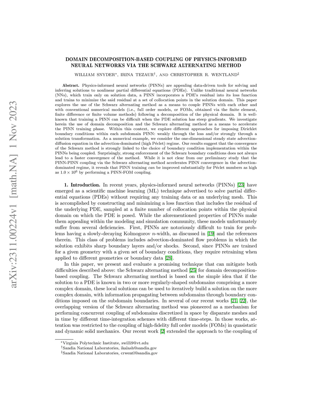 Physics-informed neural networks (PINNs) are appealing data-driven tools for solving and inferring solutions to nonlinear partial differential equations (PDEs). Unlike traditional neural networks (NNs), which train only on solution data, a PINN incorporates a PDE's residual into its loss function and trains to minimize the said residual at a set of collocation points in the solution domain. This paper explores the use of the Schwarz alternating method as a means to couple PINNs with each other and with conventional numerical models (i.e., full order models, or FOMs, obtained via the finite element, finite difference or finite volume methods) following a decomposition of the physical domain. It is well-known that training a PINN can be difficult when the PDE solution has steep gradients. We investigate herein the use of domain decomposition and the Schwarz alternating method as a means to accelerate the PINN training phase. Within this context, we explore different approaches for imposing Dirichlet boundary conditions within each subdomain PINN: weakly through the loss and/or strongly through a solution transformation. As a numerical example, we consider the one-dimensional steady state advection-diffusion equation in the advection-dominated (high Peclet) regime. Our results suggest that the convergence of the Schwarz method is strongly linked to the choice of boundary condition implementation within the PINNs being coupled. Surprisingly, strong enforcement of the Schwarz boundary conditions does not always lead to a faster convergence of the method. While it is not clear from our preliminary study that the PINN-PINN coupling via the Schwarz alternating method accelerates PINN convergence in the advection-dominated regime, it reveals that PINN training can be improved substantially for Peclet numbers as high as 1e6 by performing a PINN-FOM coupling.
