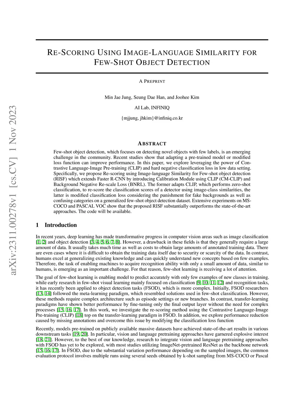 Few-shot object detection, which focuses on detecting novel objects with few labels, is an emerging challenge in the community. Recent studies show that adapting a pre-trained model or modified loss function can improve performance. In this paper, we explore leveraging the power of Contrastive Language-Image Pre-training (CLIP) and hard negative classification loss in low data setting. Specifically, we propose Re-scoring using Image-language Similarity for Few-shot object detection (RISF) which extends Faster R-CNN by introducing Calibration Module using CLIP (CM-CLIP) and Background Negative Re-scale Loss (BNRL). The former adapts CLIP, which performs zero-shot classification, to re-score the classification scores of a detector using image-class similarities, the latter is modified classification loss considering the punishment for fake backgrounds as well as confusing categories on a generalized few-shot object detection dataset. Extensive experiments on MS-COCO and PASCAL VOC show that the proposed RISF substantially outperforms the state-of-the-art approaches. The code will be available.