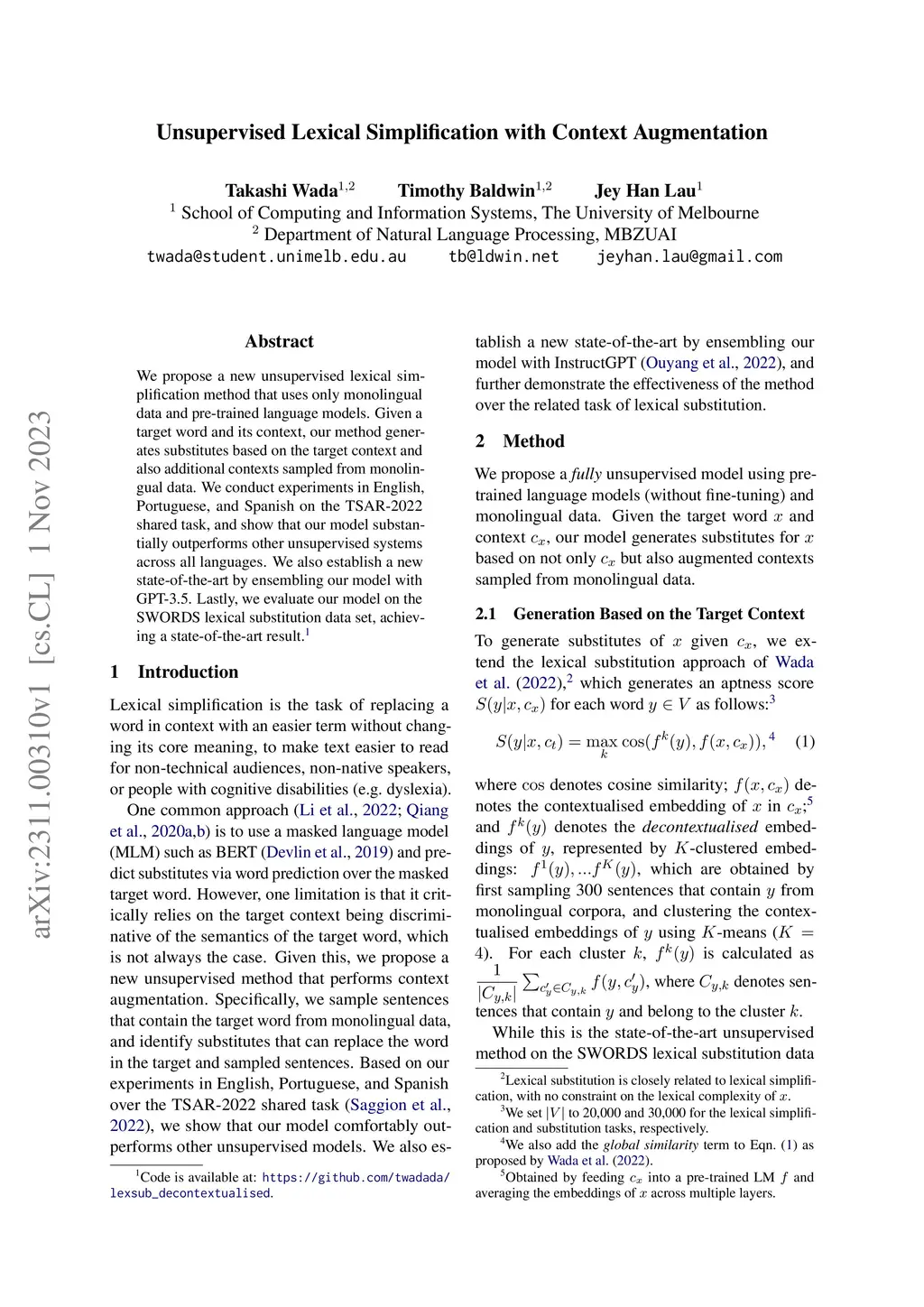 We propose a new unsupervised lexical simplification method that uses only monolingual data and pre-trained language models. Given a target word and its context, our method generates substitutes based on the target context and also additional contexts sampled from monolingual data. We conduct experiments in English, Portuguese, and Spanish on the TSAR-2022 shared task, and show that our model substantially outperforms other unsupervised systems across all languages. We also establish a new state-of-the-art by ensembling our model with GPT-3.5. Lastly, we evaluate our model on the SWORDS lexical substitution data set, achieving a state-of-the-art result.