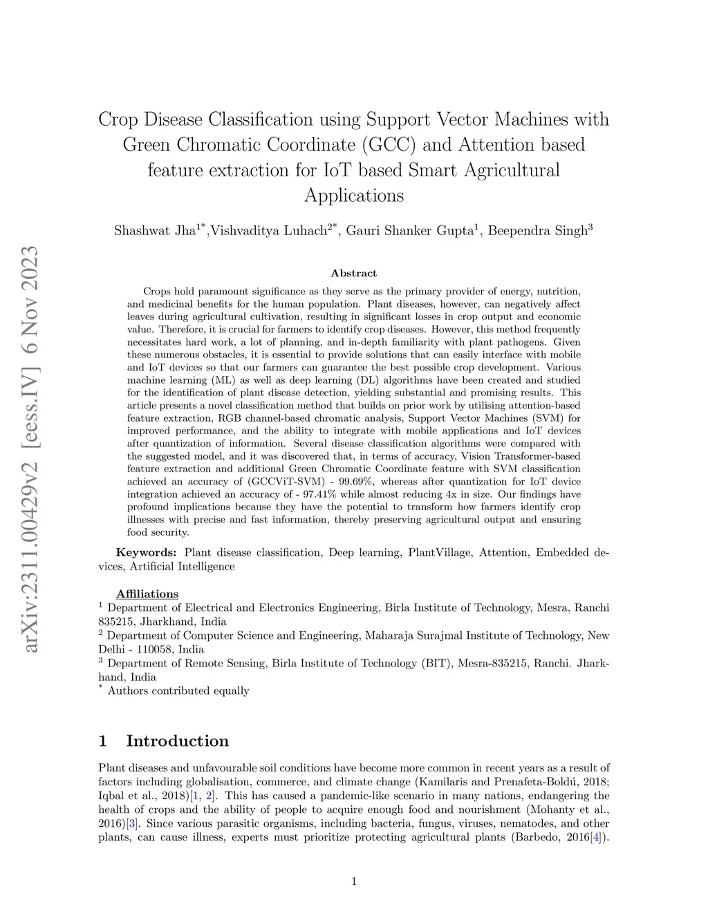 Crops hold paramount significance as they serve as the primary provider of energy, nutrition, and medicinal benefits for the human population. Plant diseases, however, can negatively affect leaves during agricultural cultivation, resulting in significant losses in crop output and economic value. Therefore, it is crucial for farmers to identify crop diseases. However, this method frequently necessitates hard work, a lot of planning, and in-depth familiarity with plant pathogens. Given these numerous obstacles, it is essential to provide solutions that can easily interface with mobile and IoT devices so that our farmers can guarantee the best possible crop development. Various machine learning (ML) as well as deep learning (DL) algorithms have been created & studied for the identification of plant disease detection, yielding substantial and promising results. This article presents a novel classification method that builds on prior work by utilising attention-based feature extraction, RGB channel-based chromatic analysis, Support Vector Machines (SVM) for improved performance, and the ability to integrate with mobile applications and IoT devices after quantization of information. Several disease classification algorithms were compared with the suggested model, and it was discovered that, in terms of accuracy, Vision Transformer-based feature extraction and additional Green Chromatic Coordinate feature with SVM classification achieved an accuracy of (GCCViT-SVM) - 99.69%, whereas after quantization for IoT device integration achieved an accuracy of - 97.41% while almost reducing 4x in size. Our findings have profound implications because they have the potential to transform how farmers identify crop illnesses with precise and fast information, thereby preserving agricultural output and ensuring food security.