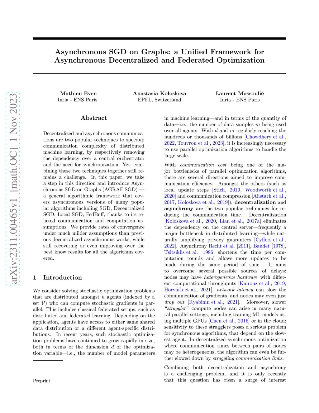 Decentralized and asynchronous communications are two popular techniques to speedup communication complexity of distributed machine learning, by respectively removing the dependency over a central orchestrator and the need for synchronization. Yet, combining these two techniques together still remains a challenge. In this paper, we take a step in this direction and introduce Asynchronous SGD on Graphs (AGRAF SGD) -- a general algorithmic framework that covers asynchronous versions of many popular algorithms including SGD, Decentralized SGD, Local SGD, FedBuff, thanks to its relaxed communication and computation assumptions. We provide rates of convergence under much milder assumptions than previous decentralized asynchronous works, while still recovering or even improving over the best know results for all the algorithms covered.