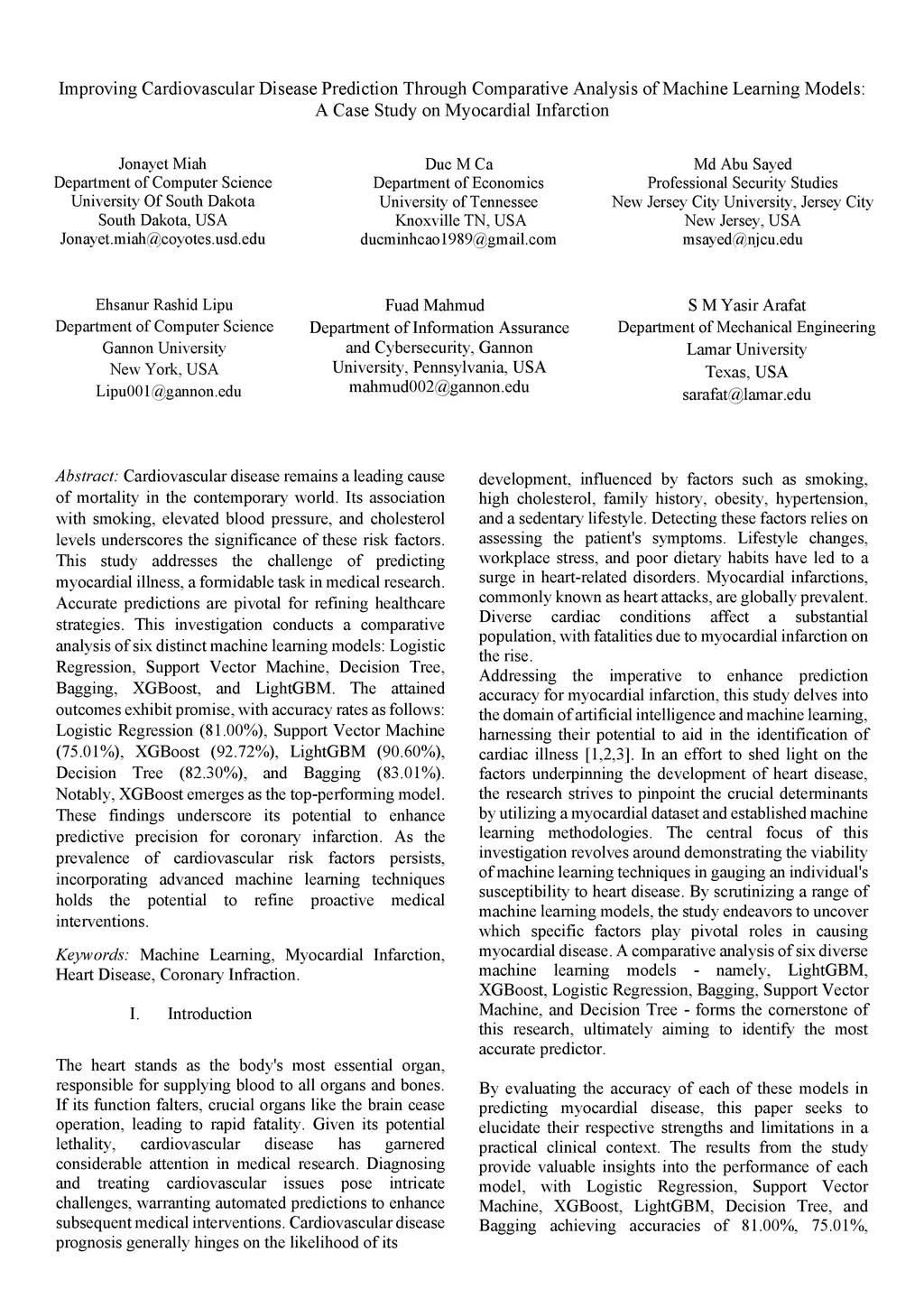 Cardiovascular disease remains a leading cause of mortality in the contemporary world. Its association with smoking, elevated blood pressure, and cholesterol levels underscores the significance of these risk factors. This study addresses the challenge of predicting myocardial illness, a formidable task in medical research. Accurate predictions are pivotal for refining healthcare strategies. This investigation conducts a comparative analysis of six distinct machine learning models: Logistic Regression, Support Vector Machine, Decision Tree, Bagging, XGBoost, and LightGBM. The attained outcomes exhibit promise, with accuracy rates as follows: Logistic Regression (81.00%), Support Vector Machine (75.01%), XGBoost (92.72%), LightGBM (90.60%), Decision Tree (82.30%), and Bagging (83.01%). Notably, XGBoost emerges as the top-performing model. These findings underscore its potential to enhance predictive precision for coronary infarction. As the prevalence of cardiovascular risk factors persists, incorporating advanced machine learning techniques holds the potential to refine proactive medical interventions.