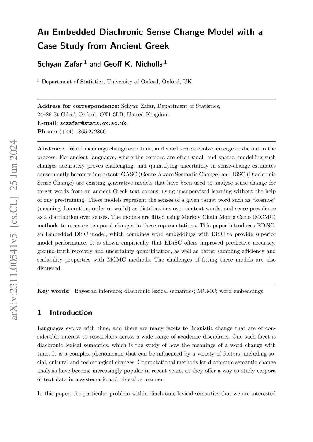 Word meanings change over time, and word senses evolve, emerge or die out in the process. For ancient languages, where the corpora are often small and sparse, modelling such changes accurately proves challenging, and quantifying uncertainty in sense-change estimates consequently becomes important. GASC (Genre-Aware Semantic Change) and DiSC (Diachronic Sense Change) are existing generative models that have been used to analyse sense change for target words from an ancient Greek text corpus, using unsupervised learning without the help of any pre-training. These models represent the senses of a given target word such as "kosmos" (meaning decoration, order or world) as distributions over context words, and sense prevalence as a distribution over senses. The models are fitted using Markov Chain Monte Carlo (MCMC) methods to measure temporal changes in these representations. This paper introduces EDiSC, an Embedded DiSC model, which combines word embeddings with DiSC to provide superior model performance. It is shown empirically that EDiSC offers improved predictive accuracy, ground-truth recovery and uncertainty quantification, as well as better sampling efficiency and scalability properties with MCMC methods. The challenges of fitting these models are also discussed.