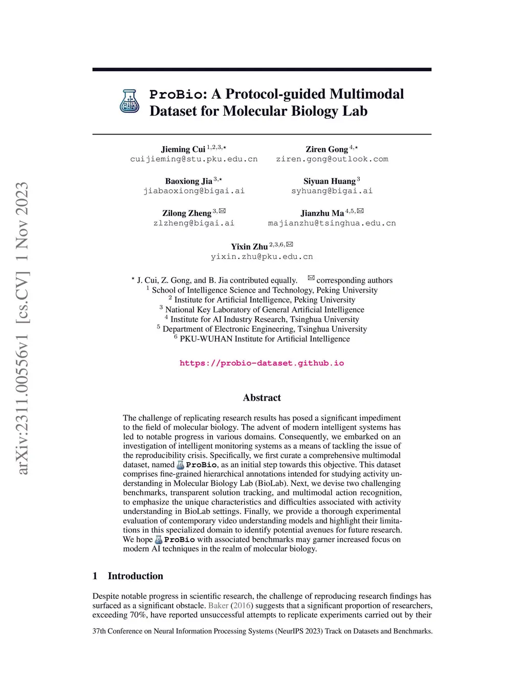The challenge of replicating research results has posed a significant impediment to the field of molecular biology. The advent of modern intelligent systems has led to notable progress in various domains. Consequently, we embarked on an investigation of intelligent monitoring systems as a means of tackling the issue of the reproducibility crisis. Specifically, we first curate a comprehensive multimodal dataset, named ProBio, as an initial step towards this objective. This dataset comprises fine-grained hierarchical annotations intended for the purpose of studying activity understanding in BioLab. Next, we devise two challenging benchmarks, transparent solution tracking and multimodal action recognition, to emphasize the unique characteristics and difficulties associated with activity understanding in BioLab settings. Finally, we provide a thorough experimental evaluation of contemporary video understanding models and highlight their limitations in this specialized domain to identify potential avenues for future research. We hope ProBio with associated benchmarks may garner increased focus on modern AI techniques in the realm of molecular biology.
