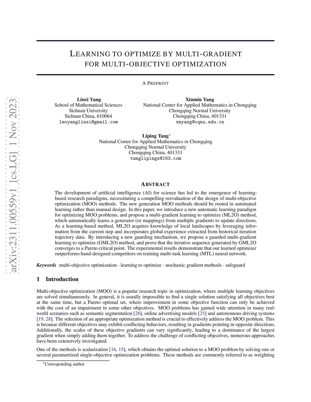 The development of artificial intelligence (AI) for science has led to the emergence of learning-based research paradigms, necessitating a compelling reevaluation of the design of multi-objective optimization (MOO) methods. The new generation MOO methods should be rooted in automated learning rather than manual design. In this paper, we introduce a new automatic learning paradigm for optimizing MOO problems, and propose a multi-gradient learning to optimize (ML2O) method, which automatically learns a generator (or mappings) from multiple gradients to update directions. As a learning-based method, ML2O acquires knowledge of local landscapes by leveraging information from the current step and incorporates global experience extracted from historical iteration trajectory data. By introducing a new guarding mechanism, we propose a guarded multi-gradient learning to optimize (GML2O) method, and prove that the iterative sequence generated by GML2O converges to a Pareto critical point. The experimental results demonstrate that our learned optimizer outperforms hand-designed competitors on training multi-task learning (MTL) neural network.