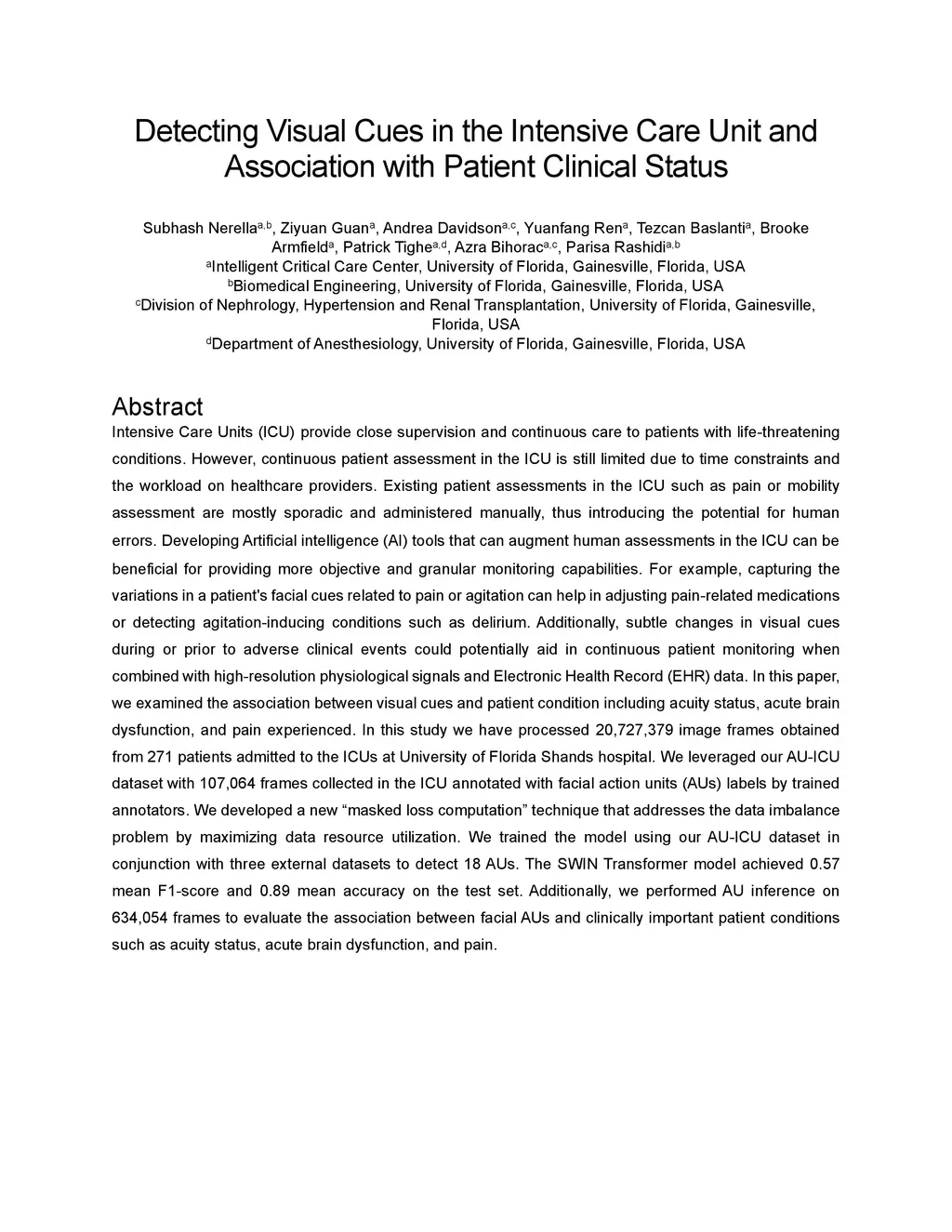 Intensive Care Units (ICU) provide close supervision and continuous care to patients with life-threatening conditions. However, continuous patient assessment in the ICU is still limited due to time constraints and the workload on healthcare providers. Existing patient assessments in the ICU such as pain or mobility assessment are mostly sporadic and administered manually, thus introducing the potential for human errors. Developing Artificial intelligence (AI) tools that can augment human assessments in the ICU can be beneficial for providing more objective and granular monitoring capabilities. For example, capturing the variations in a patient's facial cues related to pain or agitation can help in adjusting pain-related medications or detecting agitation-inducing conditions such as delirium. Additionally, subtle changes in visual cues during or prior to adverse clinical events could potentially aid in continuous patient monitoring when combined with high-resolution physiological signals and Electronic Health Record (EHR) data. In this paper, we examined the association between visual cues and patient condition including acuity status, acute brain dysfunction, and pain. We leveraged our AU-ICU dataset with 107,064 frames collected in the ICU annotated with facial action units (AUs) labels by trained annotators. We developed a new "masked loss computation" technique that addresses the data imbalance problem by maximizing data resource utilization. We trained the model using our AU-ICU dataset in conjunction with three external datasets to detect 18 AUs. The SWIN Transformer model achieved 0.57 mean F1-score and 0.89 mean accuracy on the test set. Additionally, we performed AU inference on 634,054 frames to evaluate the association between facial AUs and clinically important patient conditions such as acuity status, acute brain dysfunction, and pain.