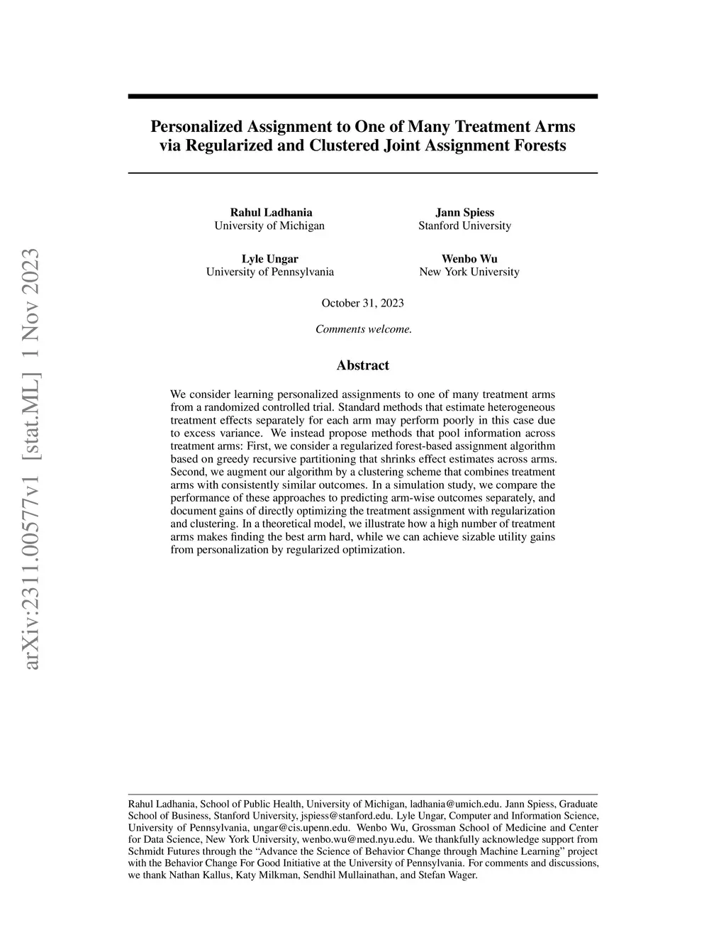 We consider learning personalized assignments to one of many treatment arms from a randomized controlled trial. Standard methods that estimate heterogeneous treatment effects separately for each arm may perform poorly in this case due to excess variance. We instead propose methods that pool information across treatment arms: First, we consider a regularized forest-based assignment algorithm based on greedy recursive partitioning that shrinks effect estimates across arms. Second, we augment our algorithm by a clustering scheme that combines treatment arms with consistently similar outcomes. In a simulation study, we compare the performance of these approaches to predicting arm-wise outcomes separately, and document gains of directly optimizing the treatment assignment with regularization and clustering. In a theoretical model, we illustrate how a high number of treatment arms makes finding the best arm hard, while we can achieve sizable utility gains from personalization by regularized optimization.