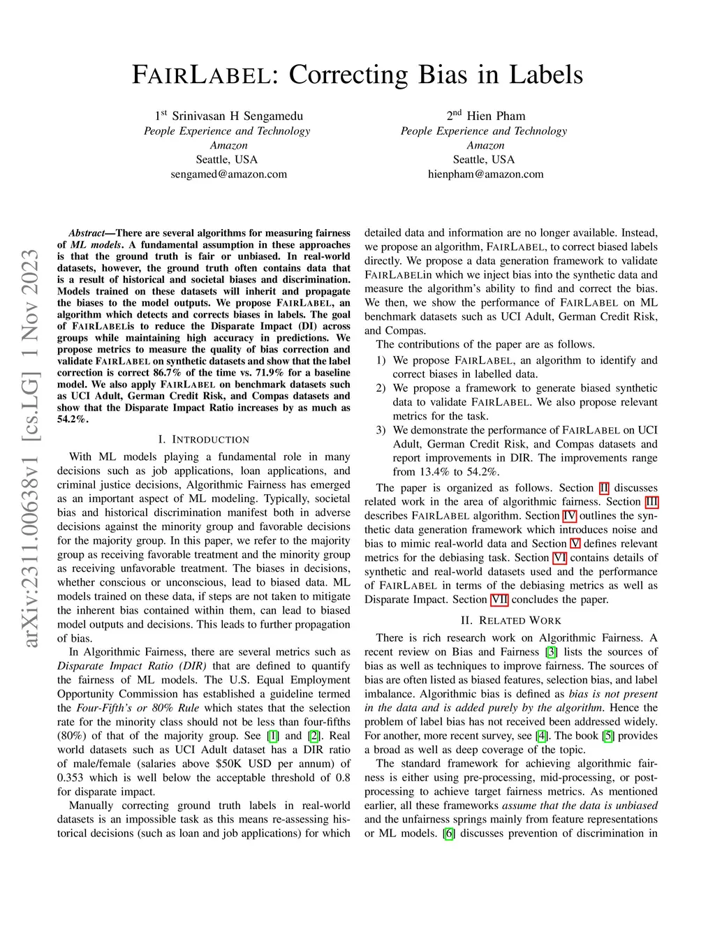 There are several algorithms for measuring fairness of ML models. A fundamental assumption in these approaches is that the ground truth is fair or unbiased. In real-world datasets, however, the ground truth often contains data that is a result of historical and societal biases and discrimination. Models trained on these datasets will inherit and propagate the biases to the model outputs. We propose FAIRLABEL, an algorithm which detects and corrects biases in labels. The goal of FAIRLABELis to reduce the Disparate Impact (DI) across groups while maintaining high accuracy in predictions. We propose metrics to measure the quality of bias correction and validate FAIRLABEL on synthetic datasets and show that the label correction is correct 86.7% of the time vs. 71.9% for a baseline model. We also apply FAIRLABEL on benchmark datasets such as UCI Adult, German Credit Risk, and Compas datasets and show that the Disparate Impact Ratio increases by as much as 54.2%.