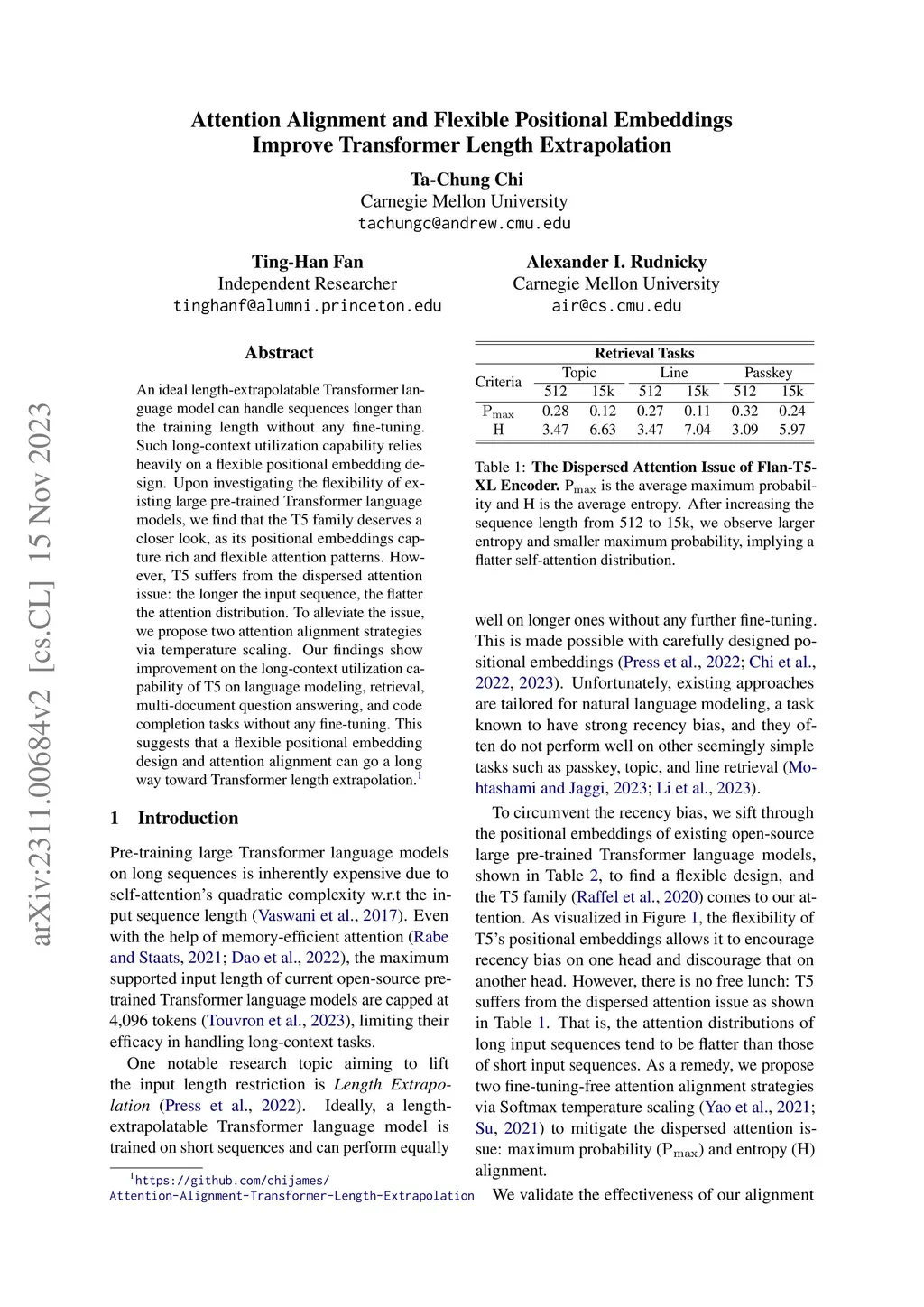 An ideal length-extrapolatable Transformer language model can handle sequences longer than the training length without any fine-tuning. Such long-context utilization capability relies heavily on a flexible positional embedding design. Upon investigating the flexibility of existing large pre-trained Transformer language models, we find that the T5 family deserves a closer look, as its positional embeddings capture rich and flexible attention patterns. However, T5 suffers from the dispersed attention issue: the longer the input sequence, the flatter the attention distribution. To alleviate the issue, we propose two attention alignment strategies via temperature scaling. Our findings show improvement on the long-context utilization capability of T5 on language modeling, retrieval, multi-document question answering, and code completion tasks without any fine-tuning. This suggests that a flexible positional embedding design and attention alignment can go a long way toward Transformer length extrapolation.