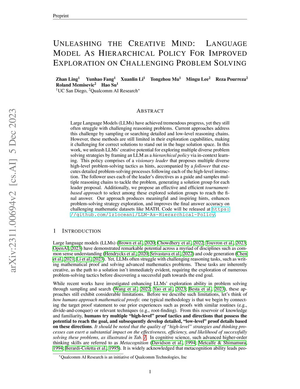 Large Language Models (LLMs) have achieved tremendous progress, yet they still often struggle with challenging reasoning problems. Current approaches address this challenge by sampling or searching detailed and low-level reasoning chains. However, these methods are still limited in their exploration capabilities, making it challenging for correct solutions to stand out in the huge solution space. In this work, we unleash LLMs' creative potential for exploring multiple diverse problem solving strategies by framing an LLM as a hierarchical policy via in-context learning. This policy comprises of a visionary leader that proposes multiple diverse high-level problem-solving tactics as hints, accompanied by a follower that executes detailed problem-solving processes following each of the high-level instruction. The follower uses each of the leader's directives as a guide and samples multiple reasoning chains to tackle the problem, generating a solution group for each leader proposal. Additionally, we propose an effective and efficient tournament-based approach to select among these explored solution groups to reach the final answer. Our approach produces meaningful and inspiring hints, enhances problem-solving strategy exploration, and improves the final answer accuracy on challenging problems in the MATH dataset. Code will be released at https://github.com/lz1oceani/LLM-As-Hierarchical-Policy.