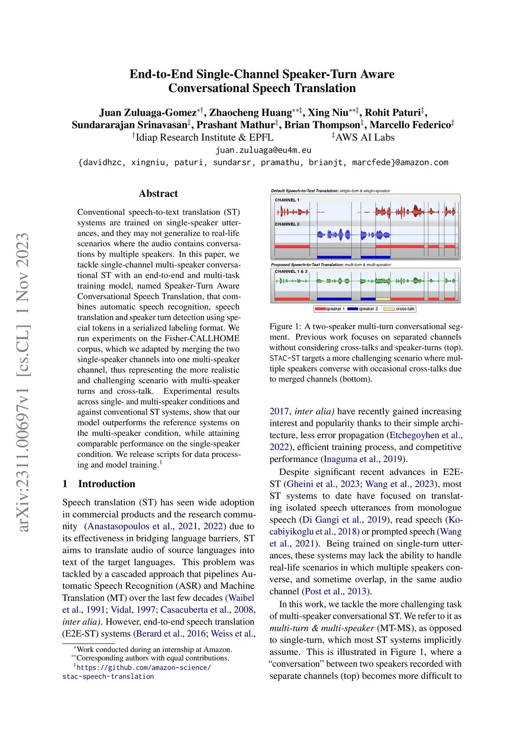 Conventional speech-to-text translation (ST) systems are trained on single-speaker utterances, and they may not generalize to real-life scenarios where the audio contains conversations by multiple speakers. In this paper, we tackle single-channel multi-speaker conversational ST with an end-to-end and multi-task training model, named Speaker-Turn Aware Conversational Speech Translation, that combines automatic speech recognition, speech translation and speaker turn detection using special tokens in a serialized labeling format. We run experiments on the Fisher-CALLHOME corpus, which we adapted by merging the two single-speaker channels into one multi-speaker channel, thus representing the more realistic and challenging scenario with multi-speaker turns and cross-talk. Experimental results across single- and multi-speaker conditions and against conventional ST systems, show that our model outperforms the reference systems on the multi-speaker condition, while attaining comparable performance on the single-speaker condition. We release scripts for data processing and model training.
