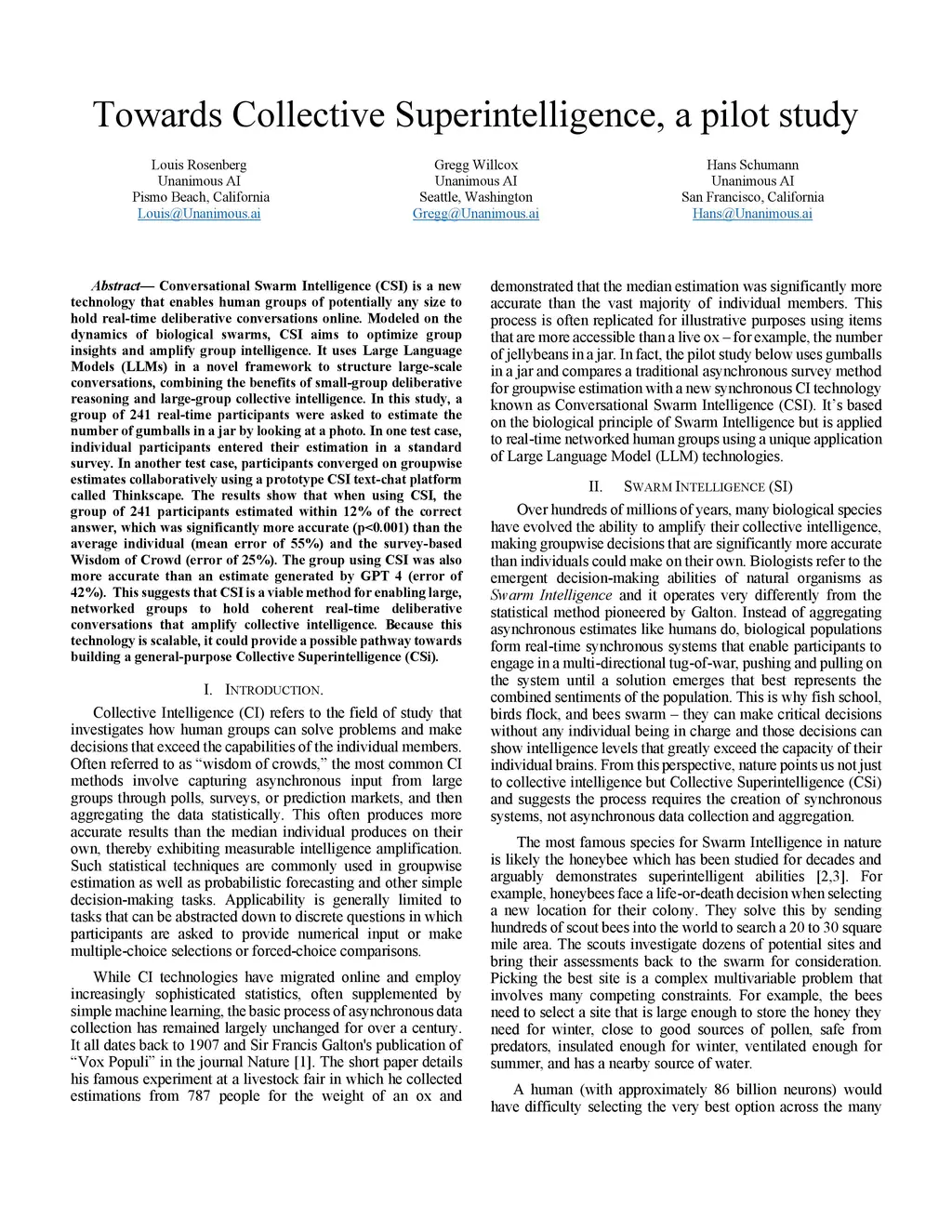 Conversational Swarm Intelligence (CSI) is a new technology that enables human groups of potentially any size to hold real-time deliberative conversations online. Modeled on the dynamics of biological swarms, CSI aims to optimize group insights and amplify group intelligence. It uses Large Language Models (LLMs) in a novel framework to structure large-scale conversations, combining the benefits of small-group deliberative reasoning and large-group collective intelligence. In this study, a group of 241 real-time participants were asked to estimate the number of gumballs in a jar by looking at a photo. In one test case, individual participants entered their estimation in a standard survey. In another test case, participants converged on groupwise estimates collaboratively using a prototype CSI text-chat platform called Thinkscape. The results show that when using CSI, the group of 241 participants estimated within 12% of the correct answer, which was significantly more accurate (p<0.001) than the average individual (mean error of 55%) and the survey-based Wisdom of Crowd (error of 25%). The group using CSI was also more accurate than an estimate generated by GPT 4 (error of 42%). This suggests that CSI is a viable method for enabling large, networked groups to hold coherent real-time deliberative conversations that amplify collective intelligence. Because this technology is scalable, it could provide a possible pathway towards building a general-purpose Collective Superintelligence (CSi).