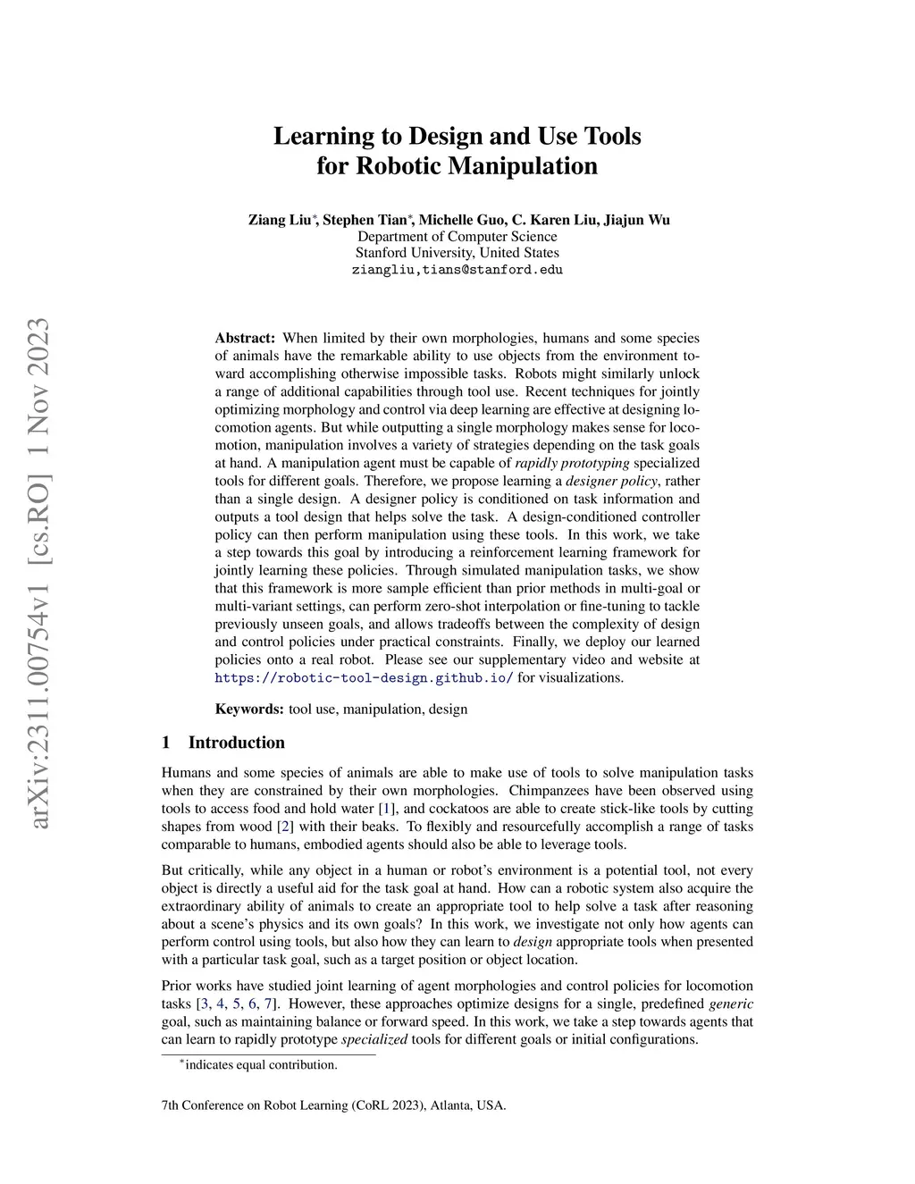 When limited by their own morphologies, humans and some species of animals have the remarkable ability to use objects from the environment toward accomplishing otherwise impossible tasks. Robots might similarly unlock a range of additional capabilities through tool use. Recent techniques for jointly optimizing morphology and control via deep learning are effective at designing locomotion agents. But while outputting a single morphology makes sense for locomotion, manipulation involves a variety of strategies depending on the task goals at hand. A manipulation agent must be capable of rapidly prototyping specialized tools for different goals. Therefore, we propose learning a designer policy, rather than a single design. A designer policy is conditioned on task information and outputs a tool design that helps solve the task. A design-conditioned controller policy can then perform manipulation using these tools. In this work, we take a step towards this goal by introducing a reinforcement learning framework for jointly learning these policies. Through simulated manipulation tasks, we show that this framework is more sample efficient than prior methods in multi-goal or multi-variant settings, can perform zero-shot interpolation or fine-tuning to tackle previously unseen goals, and allows tradeoffs between the complexity of design and control policies under practical constraints. Finally, we deploy our learned policies onto a real robot. Please see our supplementary video and website at https://robotic-tool-design.github.io/ for visualizations.