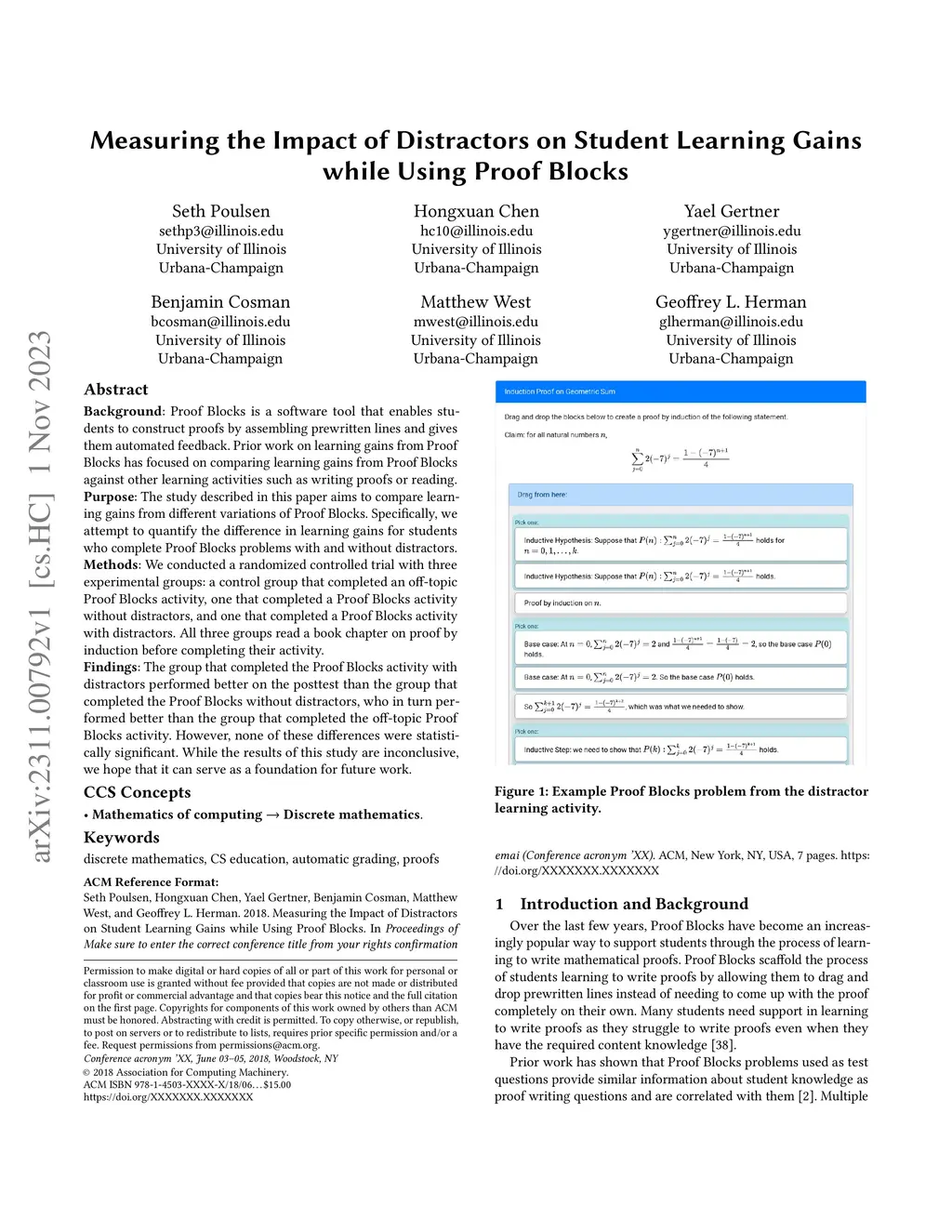 Background: Proof Blocks is a software tool that enables students to construct proofs by assembling prewritten lines and gives them automated feedback. Prior work on learning gains from Proof Blocks has focused on comparing learning gains from Proof Blocks against other learning activities such as writing proofs or reading. Purpose: The study described in this paper aims to compare learning gains from different variations of Proof Blocks. Specifically, we attempt to quantify the difference in learning gains for students who complete Proof Blocks problems with and without distractors. Methods: We conducted a randomized controlled trial with three experimental groups: a control group that completed an off-topic Proof Blocks activity, one that completed a \tool{} activity without distractors, and one that completed a Proof Blocks activity with distractors. All three groups read a book chapter on proof by induction before completing their activity. Findings: The group that completed the Proof Blocks activity with distractors performed better on the posttest than the group that completed the Proof Blocks without distractors, who in turn performed better than the group that completed the off-topic Proof Blocks activity. However, none of these differences were statistically significant. While the results of this study are inconclusive, we hope that it can serve as a foundation for future work.