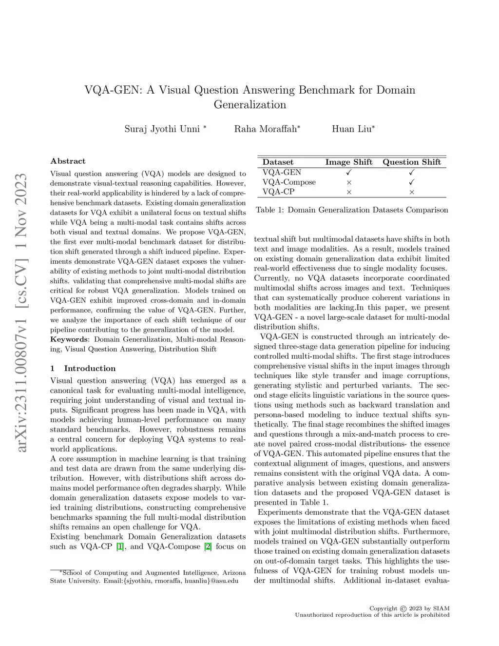 Visual question answering (VQA) models are designed to demonstrate visual-textual reasoning capabilities. However, their real-world applicability is hindered by a lack of comprehensive benchmark datasets. Existing domain generalization datasets for VQA exhibit a unilateral focus on textual shifts while VQA being a multi-modal task contains shifts across both visual and textual domains. We propose VQA-GEN, the first ever multi-modal benchmark dataset for distribution shift generated through a shift induced pipeline. Experiments demonstrate VQA-GEN dataset exposes the vulnerability of existing methods to joint multi-modal distribution shifts. validating that comprehensive multi-modal shifts are critical for robust VQA generalization. Models trained on VQA-GEN exhibit improved cross-domain and in-domain performance, confirming the value of VQA-GEN. Further, we analyze the importance of each shift technique of our pipeline contributing to the generalization of the model.