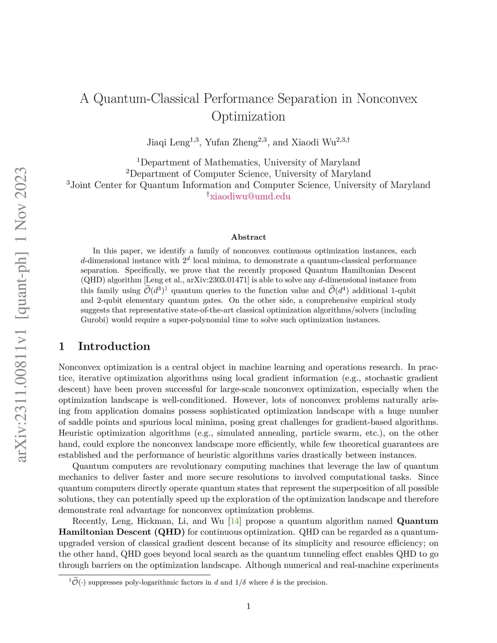 In this paper, we identify a family of nonconvex continuous optimization instances, each -dimensional instance with local minima, to demonstrate a quantum-classical performance separation. Specifically, we prove that the recently proposed Quantum Hamiltonian Descent (QHD) algorithm [Leng et al., arXiv:2303.01471] is able to solve any -dimensional instance from this family using quantum queries to the function value and additional 1-qubit and 2-qubit elementary quantum gates. On the other side, a comprehensive empirical study suggests that representative state-of-the-art classical optimization algorithms/solvers (including Gurobi) would require a super-polynomial time to solve such optimization instances.