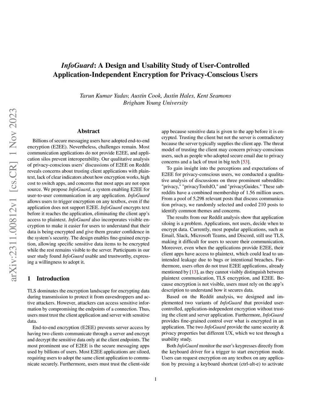 Billions of secure messaging users have adopted end-to-end encryption (E2EE). Nevertheless, challenges remain. Most communication applications do not provide E2EE, and application silos prevent interoperability. Our qualitative analysis of privacy-conscious users' discussions of E2EE on Reddit reveals concerns about trusting client applications with plaintext, lack of clear indicators about how encryption works, high cost to switch apps, and concerns that most apps are not open source. We propose InfoGuard, a system enabling E2EE for user-to-user communication in any application. InfoGuard allows users to trigger encryption on any textbox, even if the application does not support E2EE. InfoGuard encrypts text before it reaches the application, eliminating the client app's access to plaintext. InfoGuard also incorporates visible encryption to make it easier for users to understand that their data is being encrypted and give them greater confidence in the system's security. The design enables fine-grained encryption, allowing specific sensitive data items to be encrypted while the rest remains visible to the server. Participants in our user study found InfoGuard usable and trustworthy, expressing a willingness to adopt it.