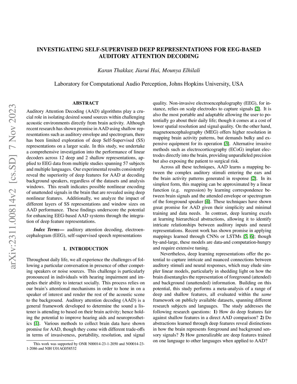 Auditory Attention Decoding (AAD) algorithms play a crucial role in isolating desired sound sources within challenging acoustic environments directly from brain activity. Although recent research has shown promise in AAD using shallow representations such as auditory envelope and spectrogram, there has been limited exploration of deep Self-Supervised (SS) representations on a larger scale. In this study, we undertake a comprehensive investigation into the performance of linear decoders across 12 deep and 2 shallow representations, applied to EEG data from multiple studies spanning 57 subjects and multiple languages. Our experimental results consistently reveal the superiority of deep features for AAD at decoding background speakers, regardless of the datasets and analysis windows. This result indicates possible nonlinear encoding of unattended signals in the brain that are revealed using deep nonlinear features. Additionally, we analyze the impact of different layers of SS representations and window sizes on AAD performance. These findings underscore the potential for enhancing EEG-based AAD systems through the integration of deep feature representations.