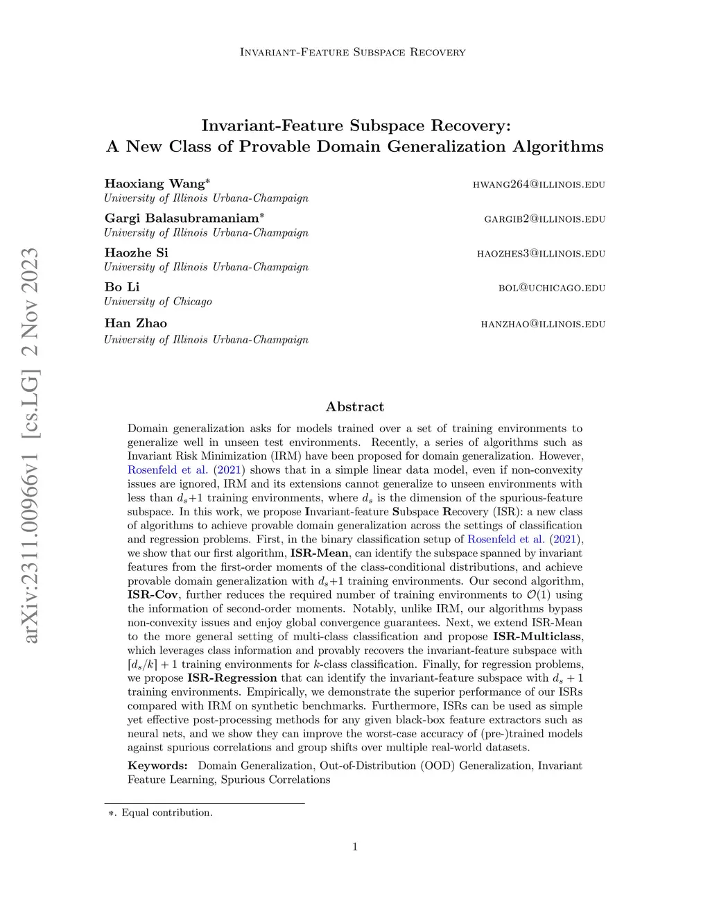 Invariant-Feature Subspace Recovery: A New Class of Provable Domain