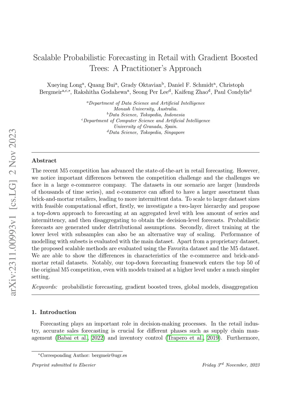 The recent M5 competition has advanced the state-of-the-art in retail forecasting. However, we notice important differences between the competition challenge and the challenges we face in a large e-commerce company. The datasets in our scenario are larger (hundreds of thousands of time series), and e-commerce can afford to have a larger assortment than brick-and-mortar retailers, leading to more intermittent data. To scale to larger dataset sizes with feasible computational effort, firstly, we investigate a two-layer hierarchy and propose a top-down approach to forecasting at an aggregated level with less amount of series and intermittency, and then disaggregating to obtain the decision-level forecasts. Probabilistic forecasts are generated under distributional assumptions. Secondly, direct training at the lower level with subsamples can also be an alternative way of scaling. Performance of modelling with subsets is evaluated with the main dataset. Apart from a proprietary dataset, the proposed scalable methods are evaluated using the Favorita dataset and the M5 dataset. We are able to show the differences in characteristics of the e-commerce and brick-and-mortar retail datasets. Notably, our top-down forecasting framework enters the top 50 of the original M5 competition, even with models trained at a higher level under a much simpler setting.