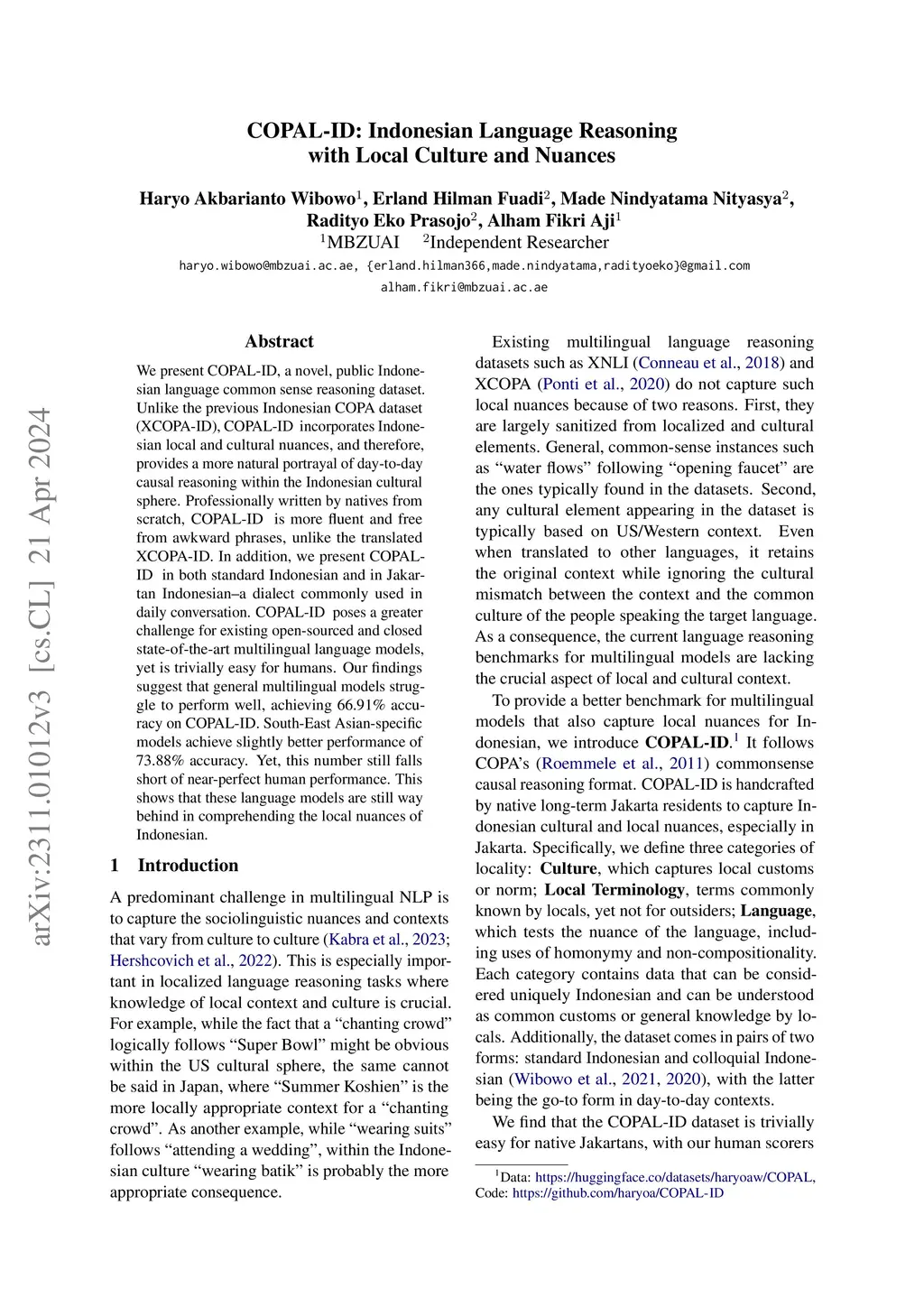 We present COPAL-ID, a novel, public Indonesian language common sense reasoning dataset. Unlike the previous Indonesian COPA dataset (XCOPA-ID), COPAL-ID incorporates Indonesian local and cultural nuances, and therefore, provides a more natural portrayal of day-to-day causal reasoning within the Indonesian cultural sphere. Professionally written by natives from scratch, COPAL-ID is more fluent and free from awkward phrases, unlike the translated XCOPA-ID. In addition, we present COPAL-ID in both standard Indonesian and in Jakartan Indonesian-a dialect commonly used in daily conversation. COPAL-ID poses a greater challenge for existing open-sourced and closed state-of-the-art multilingual language models, yet is trivially easy for humans. Our findings suggest that general multilingual models struggle to perform well, achieving 66.91% accuracy on COPAL-ID. South-East Asian-specific models achieve slightly better performance of 73.88% accuracy. Yet, this number still falls short of near-perfect human performance. This shows that these language models are still way behind in comprehending the local nuances of Indonesian.