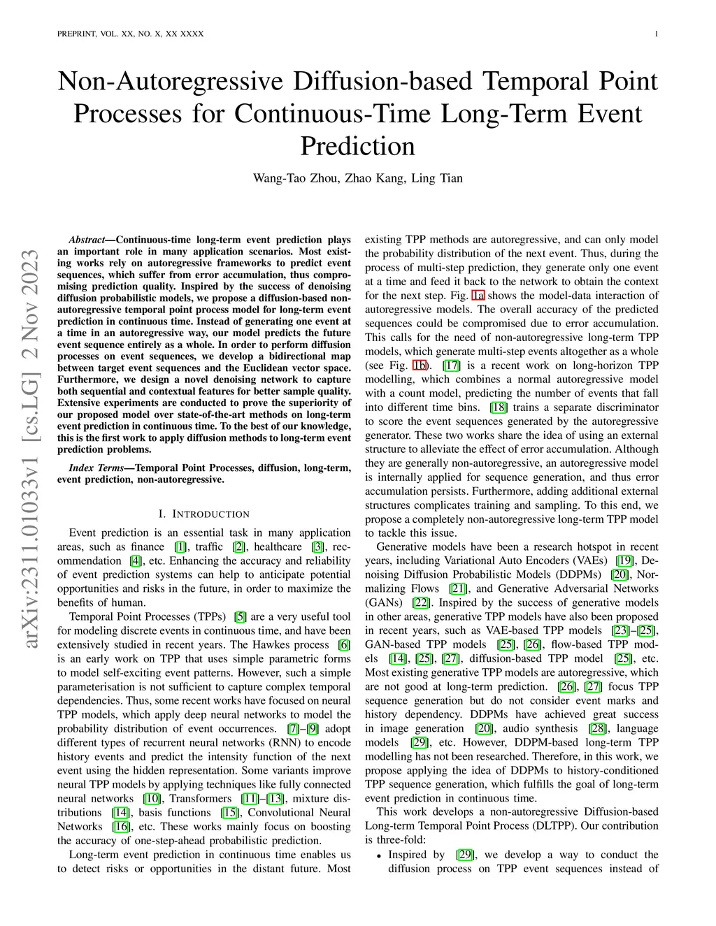 Continuous-time long-term event prediction plays an important role in many application scenarios. Most existing works rely on autoregressive frameworks to predict event sequences, which suffer from error accumulation, thus compromising prediction quality. Inspired by the success of denoising diffusion probabilistic models, we propose a diffusion-based non-autoregressive temporal point process model for long-term event prediction in continuous time. Instead of generating events one at a time in an autoregressive way, our model predicts the future event sequence entirely as a whole. In order to perform diffusion processes on event sequences, we develop a bidirectional map between target event sequences and the Euclidean vector space. Furthermore, we design a novel denoising network to capture both sequential and contextual features for better sample quality. Extensive experiments are conducted to prove the superiority of our proposed model over state-of-the-art methods on long-term event prediction in continuous time. To the best of our knowledge, this is the first work to apply diffusion methods to long-term event prediction problems.
