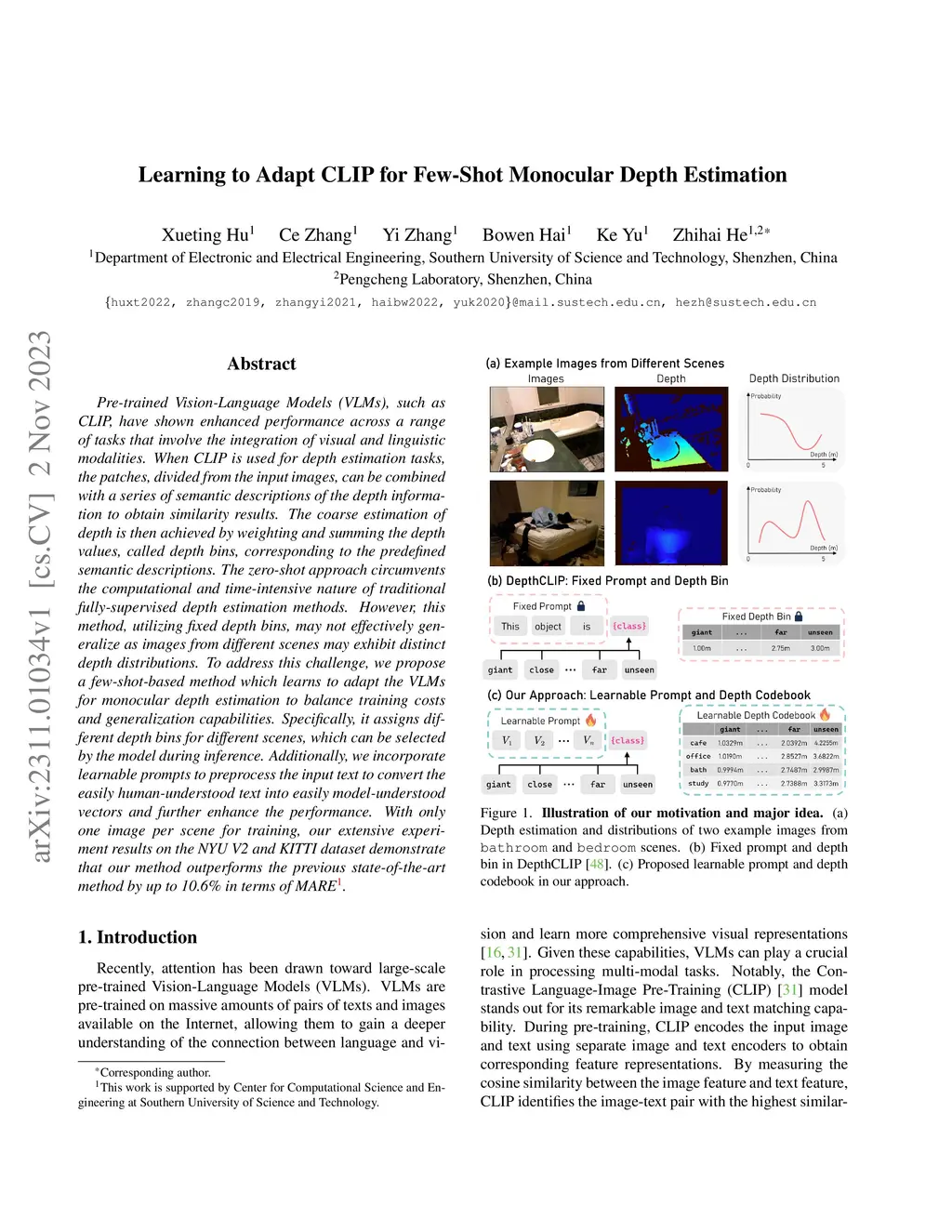 Pre-trained Vision-Language Models (VLMs), such as CLIP, have shown enhanced performance across a range of tasks that involve the integration of visual and linguistic modalities. When CLIP is used for depth estimation tasks, the patches, divided from the input images, can be combined with a series of semantic descriptions of the depth information to obtain similarity results. The coarse estimation of depth is then achieved by weighting and summing the depth values, called depth bins, corresponding to the predefined semantic descriptions. The zero-shot approach circumvents the computational and time-intensive nature of traditional fully-supervised depth estimation methods. However, this method, utilizing fixed depth bins, may not effectively generalize as images from different scenes may exhibit distinct depth distributions. To address this challenge, we propose a few-shot-based method which learns to adapt the VLMs for monocular depth estimation to balance training costs and generalization capabilities. Specifically, it assigns different depth bins for different scenes, which can be selected by the model during inference. Additionally, we incorporate learnable prompts to preprocess the input text to convert the easily human-understood text into easily model-understood vectors and further enhance the performance. With only one image per scene for training, our extensive experiment results on the NYU V2 and KITTI dataset demonstrate that our method outperforms the previous state-of-the-art method by up to 10.6\% in terms of MARE.
