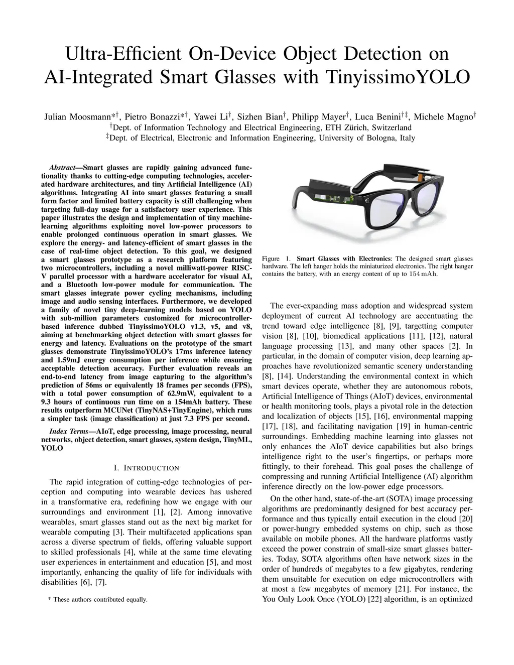 Smart glasses are rapidly gaining advanced functions thanks to cutting-edge computing technologies, especially accelerated hardware architectures, and tiny Artificial Intelligence (AI) algorithms. However, integrating AI into smart glasses featuring a small form factor and limited battery capacity remains challenging for a satisfactory user experience. To this end, this paper proposes the design of a smart glasses platform for always-on on-device object detection with an all-day battery lifetime. The proposed platform is based on GAP9, a novel multi-core RISC-V processor from Greenwaves Technologies. Additionally, a family of sub-million parameter TinyissimoYOLO networks are proposed. They are benchmarked on established datasets, capable of differentiating up to 80 classes on MS-COCO. Evaluations on the smart glasses prototype demonstrate TinyissimoYOLO's inference latency of only 17ms and consuming 1.59mJ energy per inference. An end-to-end latency of 56ms is achieved which is equivalent to 18 frames per seconds (FPS) with a total power consumption of 62.9mW. This ensures continuous system runtime of up to 9.3 hours on a 154mAh battery. These results outperform MCUNet (TinyNAS+TinyEngine), which runs a simpler task (image classification) at just 7.3 FPS, while the 18 FPS achieved in this paper even include image-capturing, network inference, and detection post-processing. The algorithm's code is released open with this paper and can be found here:this https URL