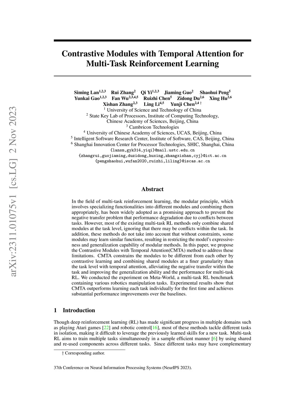 Contrastive Modules with Temporal Attention for Multi-Task Reinforcement