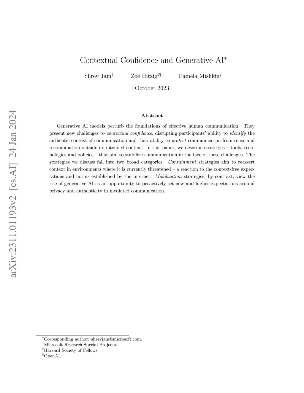 Generative AI models perturb the foundations of effective human communication. They present new challenges to contextual confidence, disrupting participants' ability to identify the authentic context of communication and their ability to protect communication from reuse and recombination outside its intended context. In this paper, we describe strategies--tools, technologies and policies--that aim to stabilize communication in the face of these challenges. The strategies we discuss fall into two broad categories. Containment strategies aim to reassert context in environments where it is currently threatened--a reaction to the context-free expectations and norms established by the internet. Mobilization strategies, by contrast, view the rise of generative AI as an opportunity to proactively set new and higher expectations around privacy and authenticity in mediated communication.