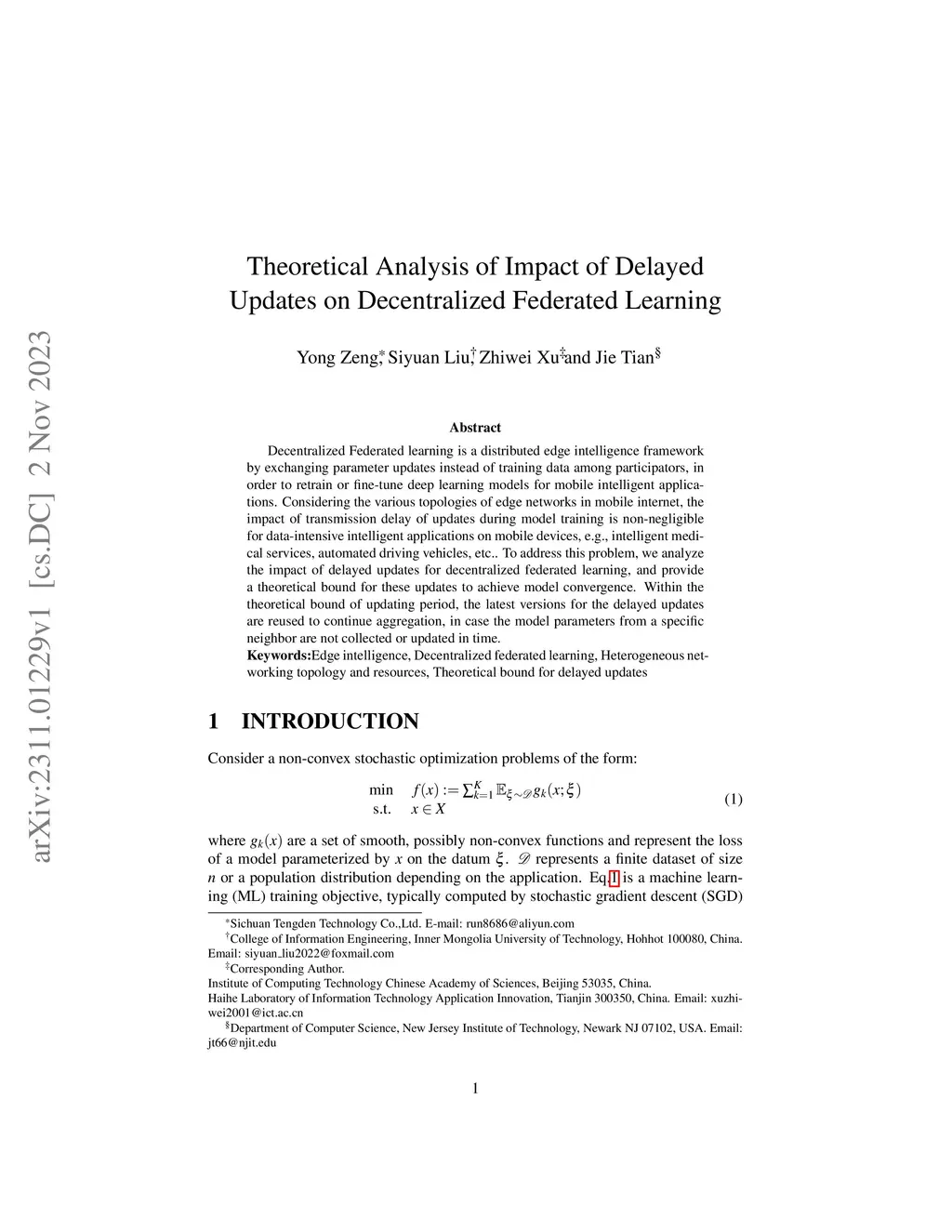Decentralized Federated learning is a distributed edge intelligence framework by exchanging parameter updates instead of training data among participators, in order to retrain or fine-tune deep learning models for mobile intelligent applications. Considering the various topologies of edge networks in mobile internet, the impact of transmission delay of updates during model training is non-negligible for data-intensive intelligent applications on mobile devices, e.g., intelligent medical services, automated driving vehicles, etc.. To address this problem, we analyze the impact of delayed updates for decentralized federated learning, and provide a theoretical bound for these updates to achieve model convergence. Within the theoretical bound of updating period, the latest versions for the delayed updates are reused to continue aggregation, in case the model parameters from a specific neighbor are not collected or updated in time.