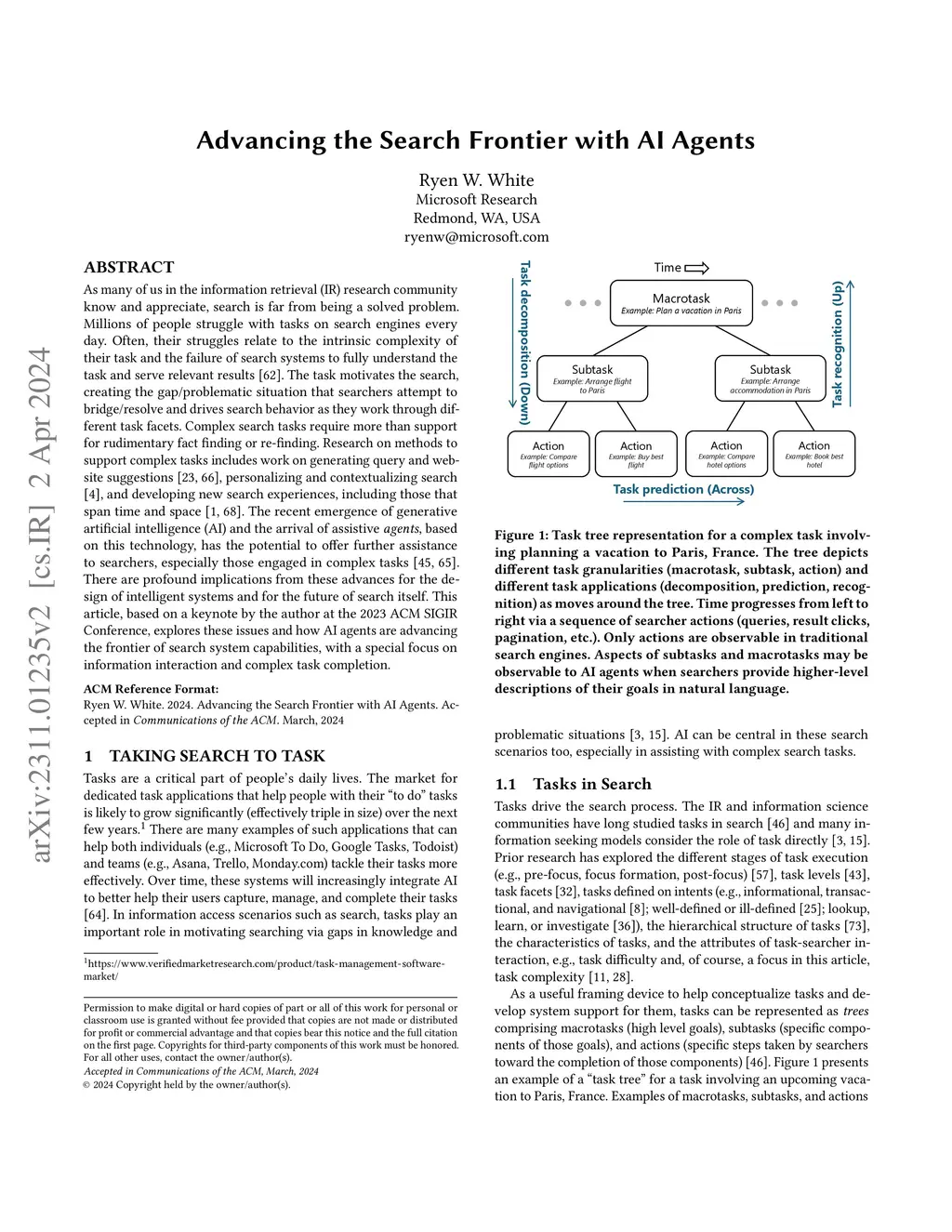 As many of us in the information retrieval (IR) research community know and appreciate, search is far from being a solved problem. Millions of people struggle with tasks on search engines every day. Often, their struggles relate to the intrinsic complexity of their task and the failure of search systems to fully understand the task and serve relevant results. The task motivates the search, creating the gap/problematic situation that searchers attempt to bridge/resolve and drives search behavior as they work through different task facets. Complex search tasks require more than support for rudimentary fact finding or re-finding. Research on methods to support complex tasks includes work on generating query and website suggestions, personalizing and contextualizing search, and developing new search experiences, including those that span time and space. The recent emergence of generative artificial intelligence (AI) and the arrival of assistive agents, based on this technology, has the potential to offer further assistance to searchers, especially those engaged in complex tasks. There are profound implications from these advances for the design of intelligent systems and for the future of search itself. This article, based on a keynote by the author at the 2023 ACM SIGIR Conference, explores these issues and how AI agents are advancing the frontier of search system capabilities, with a special focus on information interaction and complex task completion.
