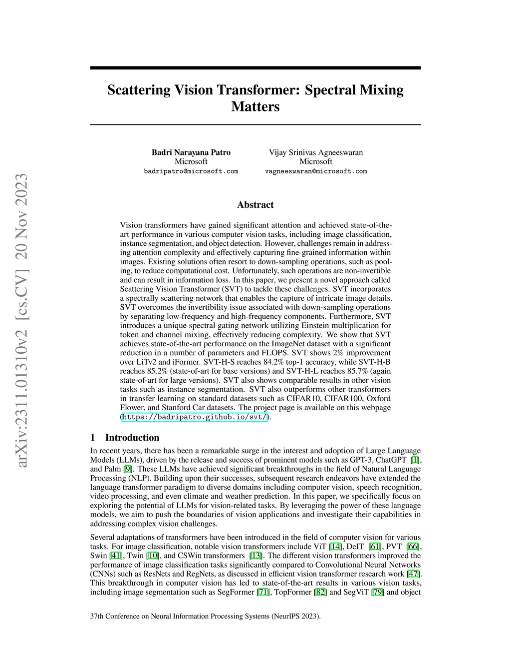 Vision transformers have gained significant attention and achieved state-of-the-art performance in various computer vision tasks, including image classification, instance segmentation, and object detection. However, challenges remain in addressing attention complexity and effectively capturing fine-grained information within images. Existing solutions often resort to down-sampling operations, such as pooling, to reduce computational cost. Unfortunately, such operations are non-invertible and can result in information loss. In this paper, we present a novel approach called Scattering Vision Transformer (SVT) to tackle these challenges. SVT incorporates a spectrally scattering network that enables the capture of intricate image details. SVT overcomes the invertibility issue associated with down-sampling operations by separating low-frequency and high-frequency components. Furthermore, SVT introduces a unique spectral gating network utilizing Einstein multiplication for token and channel mixing, effectively reducing complexity. We show that SVT achieves state-of-the-art performance on the ImageNet dataset with a significant reduction in a number of parameters and FLOPS. SVT shows 2\% improvement over LiTv2 and iFormer. SVT-H-S reaches 84.2\% top-1 accuracy, while SVT-H-B reaches 85.2\% (state-of-art for base versions) and SVT-H-L reaches 85.7\% (again state-of-art for large versions). SVT also shows comparable results in other vision tasks such as instance segmentation. SVT also outperforms other transformers in transfer learning on standard datasets such as CIFAR10, CIFAR100, Oxford Flower, and Stanford Car datasets. The project page is available on this webpage.\url{https://badripatro.github.io/svt/}.