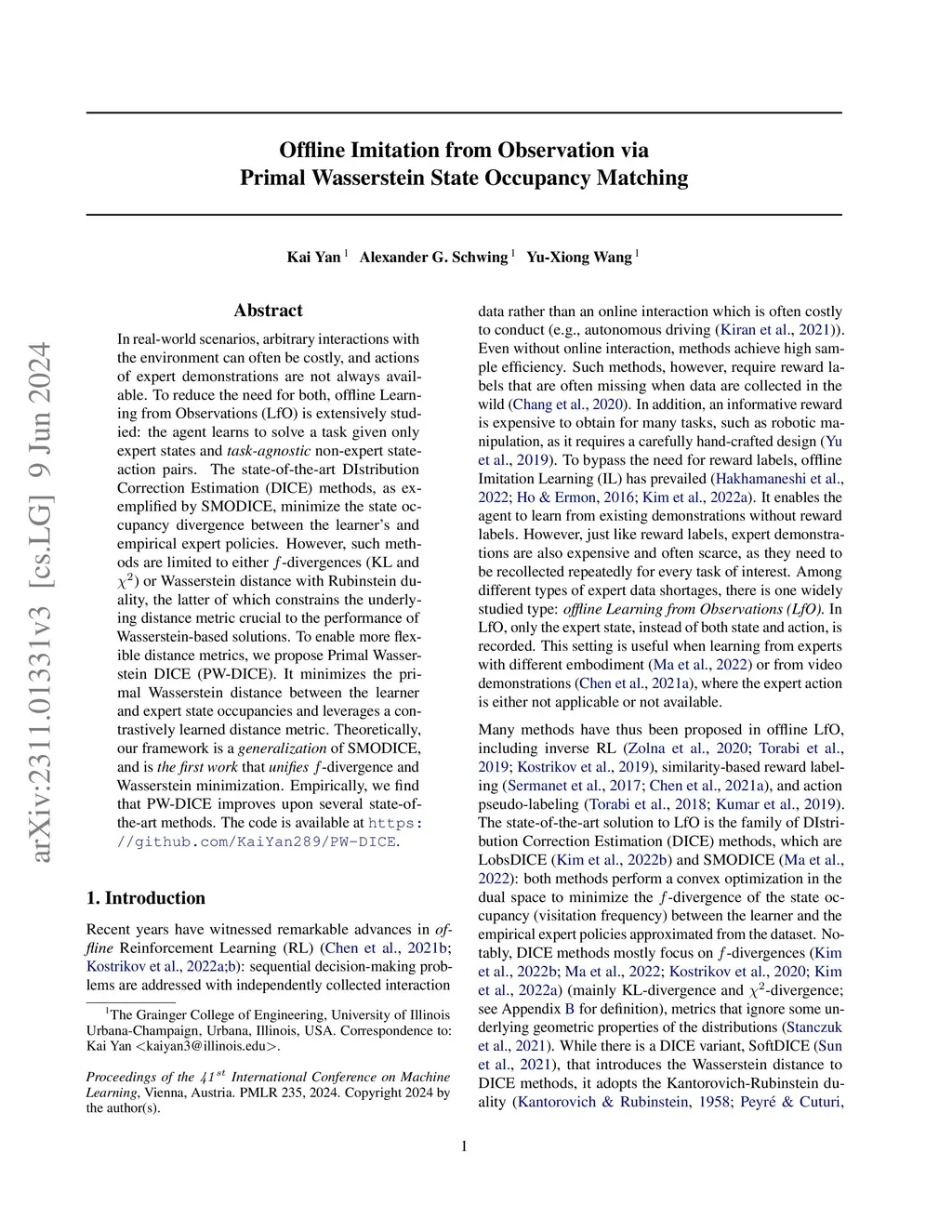 In real-world scenarios, arbitrary interactions with the environment can often be costly, and actions of expert demonstrations are not always available. To reduce the need for both, offline Learning from Observations (LfO) is extensively studied: the agent learns to solve a task given only expert states and task-agnostic non-expert state-action pairs. The state-of-the-art DIstribution Correction Estimation (DICE) methods, as exemplified by SMODICE, minimize the state occupancy divergence between the learner's and empirical expert policies. However, such methods are limited to either -divergences (KL and ) or Wasserstein distance with Rubinstein duality, the latter of which constrains the underlying distance metric crucial to the performance of Wasserstein-based solutions. To enable more flexible distance metrics, we propose Primal Wasserstein DICE (PW-DICE). It minimizes the primal Wasserstein distance between the learner and expert state occupancies and leverages a contrastively learned distance metric. Theoretically, our framework is a generalization of SMODICE, and is the first work that unifies -divergence and Wasserstein minimization. Empirically, we find that PW-DICE improves upon several state-of-the-art methods. The code is available at https://github.com/KaiYan289/PW-DICE.