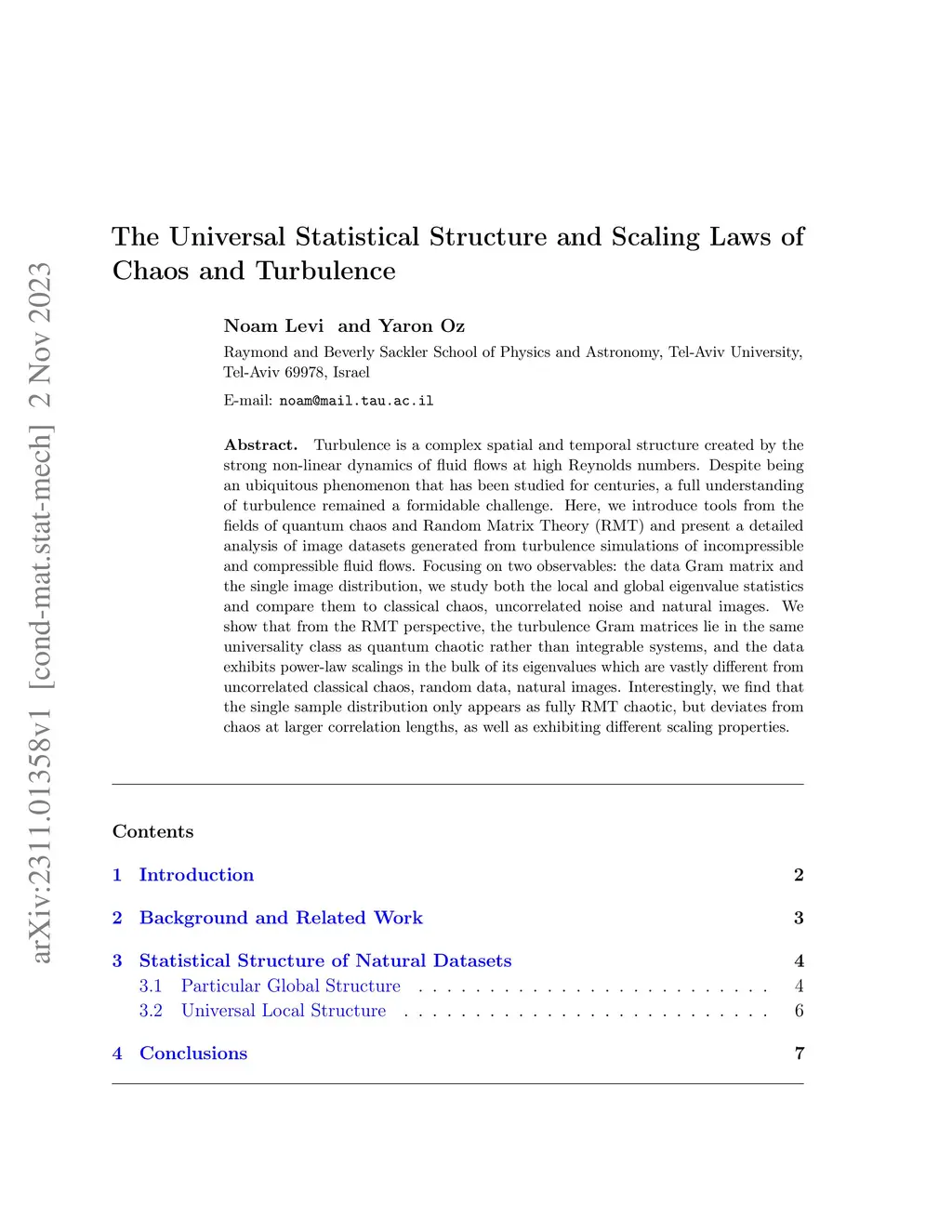 Turbulence is a complex spatial and temporal structure created by the strong non-linear dynamics of fluid flows at high Reynolds numbers. Despite being an ubiquitous phenomenon that has been studied for centuries, a full understanding of turbulence remained a formidable challenge. Here, we introduce tools from the fields of quantum chaos and Random Matrix Theory (RMT) and present a detailed analysis of image datasets generated from turbulence simulations of incompressible and compressible fluid flows. Focusing on two observables: the data Gram matrix and the single image distribution, we study both the local and global eigenvalue statistics and compare them to classical chaos, uncorrelated noise and natural images. We show that from the RMT perspective, the turbulence Gram matrices lie in the same universality class as quantum chaotic rather than integrable systems, and the data exhibits power-law scalings in the bulk of its eigenvalues which are vastly different from uncorrelated classical chaos, random data, natural images. Interestingly, we find that the single sample distribution only appears as fully RMT chaotic, but deviates from chaos at larger correlation lengths, as well as exhibiting different scaling properties.