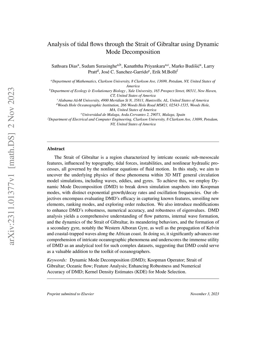 The Strait of Gibraltar is a region characterized by intricate oceanic sub-mesoscale features, influenced by topography, tidal forces, instabilities, and nonlinear hydraulic processes, all governed by the nonlinear equations of fluid motion. In this study, we aim to uncover the underlying physics of these phenomena within 3D MIT general circulation model simulations, including waves, eddies, and gyres. To achieve this, we employ Dynamic Mode Decomposition (DMD) to break down simulation snapshots into Koopman modes, with distinct exponential growth/decay rates and oscillation frequencies. Our objectives encompass evaluating DMD's efficacy in capturing known features, unveiling new elements, ranking modes, and exploring order reduction. We also introduce modifications to enhance DMD's robustness, numerical accuracy, and robustness of eigenvalues. DMD analysis yields a comprehensive understanding of flow patterns, internal wave formation, and the dynamics of the Strait of Gibraltar, its meandering behaviors, and the formation of a secondary gyre, notably the Western Alboran Gyre, as well as the propagation of Kelvin and coastal-trapped waves along the African coast. In doing so, it significantly advances our comprehension of intricate oceanographic phenomena and underscores the immense utility of DMD as an analytical tool for such complex datasets, suggesting that DMD could serve as a valuable addition to the toolkit of oceanographers.