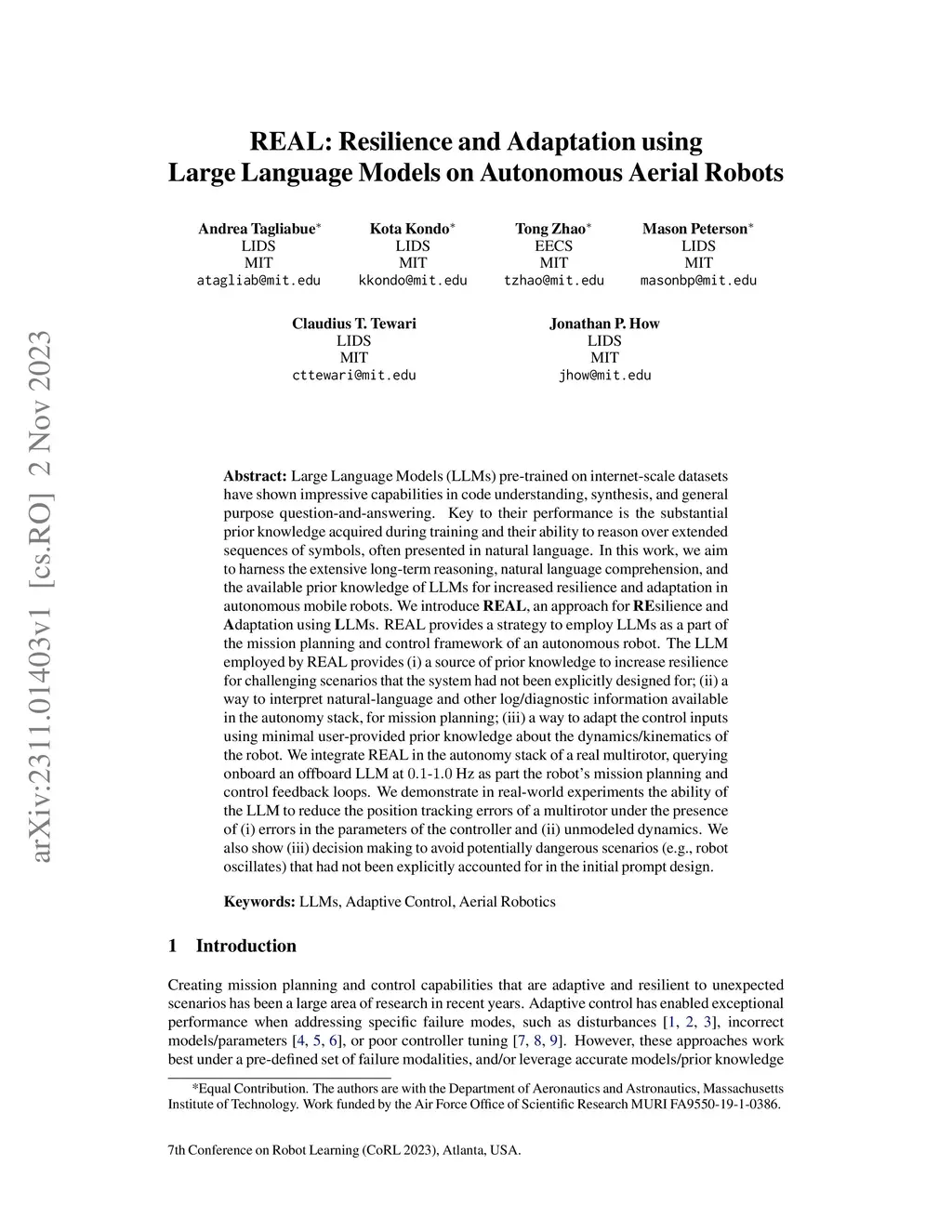 Large Language Models (LLMs) pre-trained on internet-scale datasets have shown impressive capabilities in code understanding, synthesis, and general purpose question-and-answering. Key to their performance is the substantial prior knowledge acquired during training and their ability to reason over extended sequences of symbols, often presented in natural language. In this work, we aim to harness the extensive long-term reasoning, natural language comprehension, and the available prior knowledge of LLMs for increased resilience and adaptation in autonomous mobile robots. We introduce REAL, an approach for REsilience and Adaptation using LLMs. REAL provides a strategy to employ LLMs as a part of the mission planning and control framework of an autonomous robot. The LLM employed by REAL provides (i) a source of prior knowledge to increase resilience for challenging scenarios that the system had not been explicitly designed for; (ii) a way to interpret natural-language and other log/diagnostic information available in the autonomy stack, for mission planning; (iii) a way to adapt the control inputs using minimal user-provided prior knowledge about the dynamics/kinematics of the robot. We integrate REAL in the autonomy stack of a real multirotor, querying onboard an offboard LLM at 0.1-1.0 Hz as part the robot's mission planning and control feedback loops. We demonstrate in real-world experiments the ability of the LLM to reduce the position tracking errors of a multirotor under the presence of (i) errors in the parameters of the controller and (ii) unmodeled dynamics. We also show (iii) decision making to avoid potentially dangerous scenarios (e.g., robot oscillates) that had not been explicitly accounted for in the initial prompt design.
