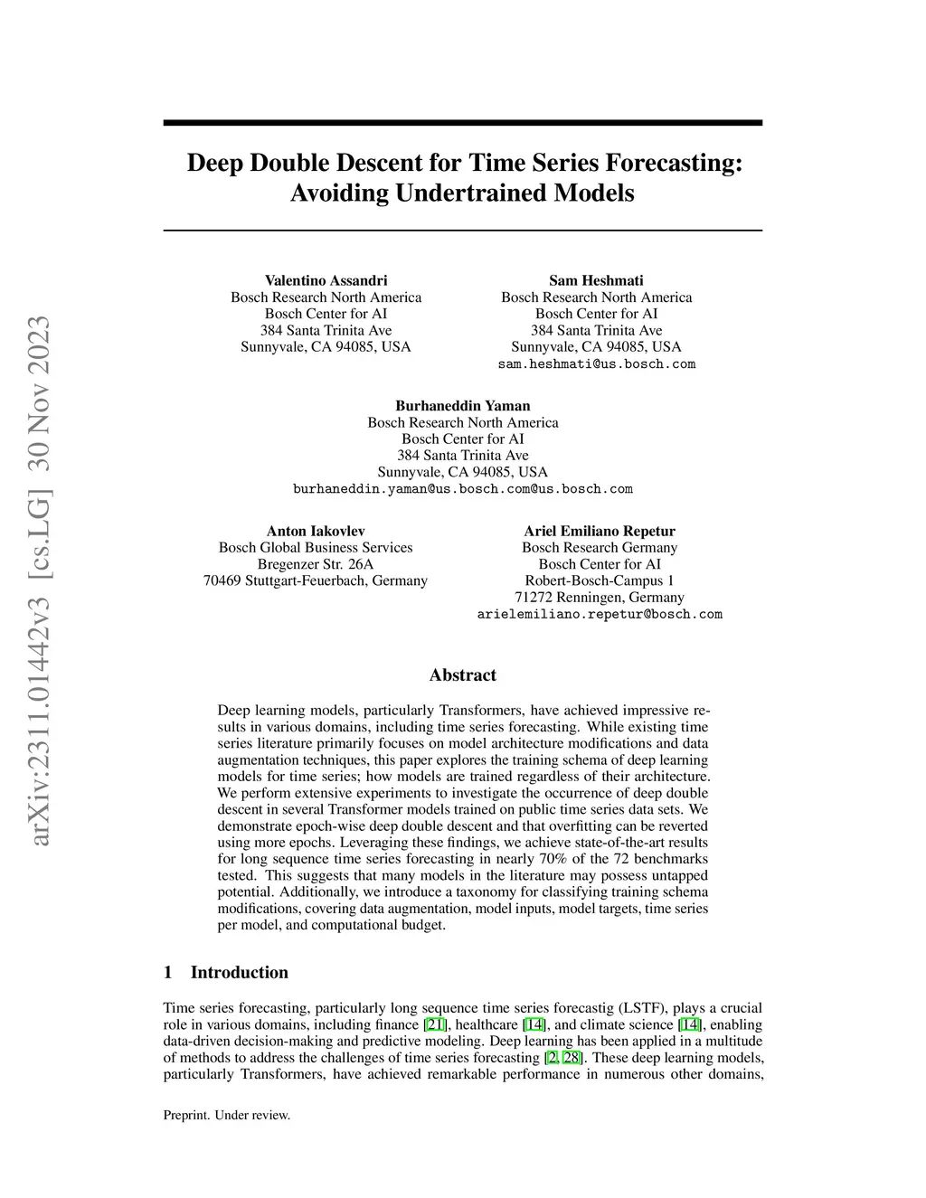 Deep learning models, particularly Transformers, have achieved impressive results in various domains, including time series forecasting. While existing time series literature primarily focuses on model architecture modifications and data augmentation techniques, this paper explores the training schema of deep learning models for time series; how models are trained regardless of their architecture. We perform extensive experiments to investigate the occurrence of deep double descent in several Transformer models trained on public time series data sets. We demonstrate epoch-wise deep double descent and that overfitting can be reverted using more epochs. Leveraging these findings, we achieve state-of-the-art results for long sequence time series forecasting in nearly 70% of the 72 benchmarks tested. This suggests that many models in the literature may possess untapped potential. Additionally, we introduce a taxonomy for classifying training schema modifications, covering data augmentation, model inputs, model targets, time series per model, and computational budget.