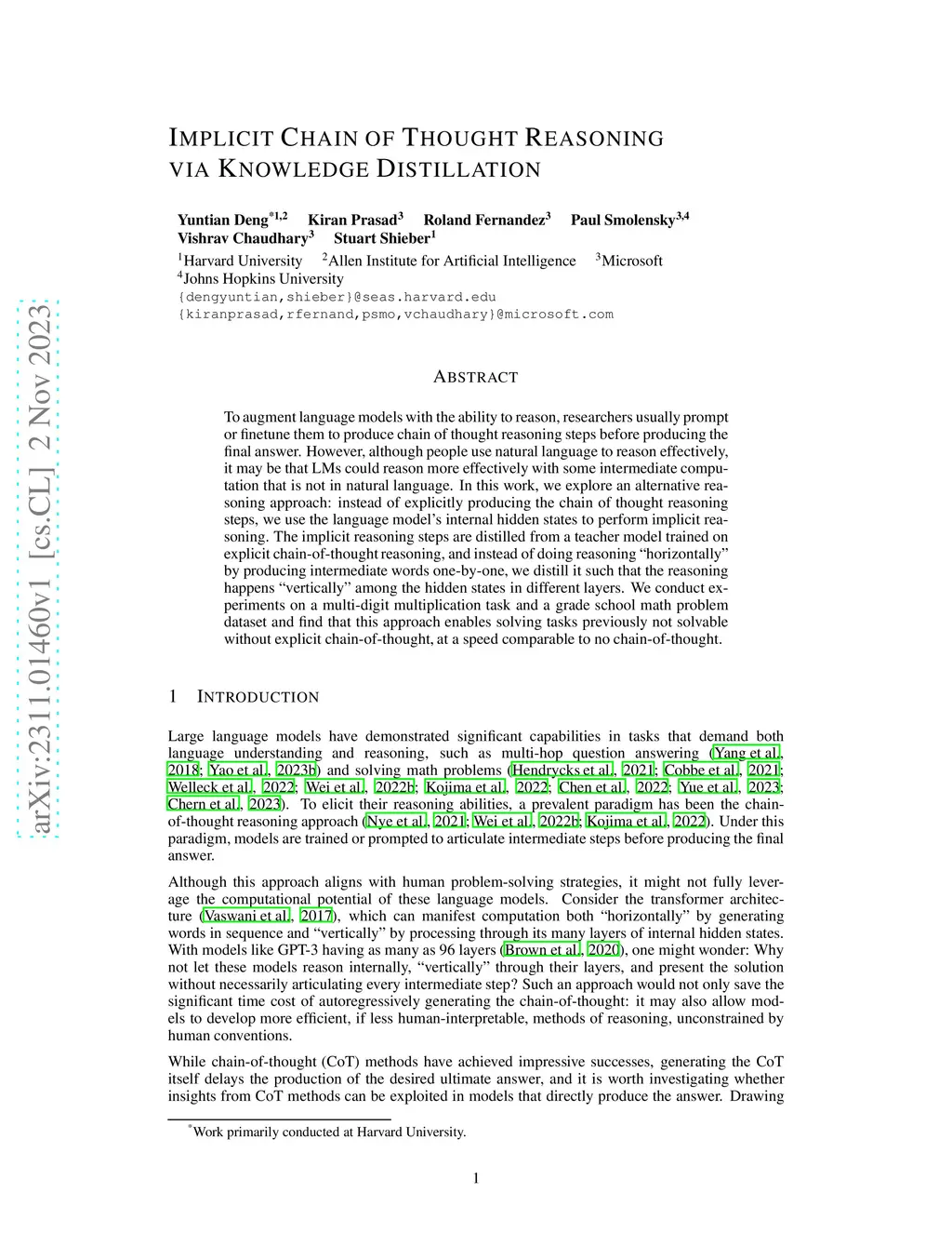 To augment language models with the ability to reason, researchers usually prompt or finetune them to produce chain of thought reasoning steps before producing the final answer. However, although people use natural language to reason effectively, it may be that LMs could reason more effectively with some intermediate computation that is not in natural language. In this work, we explore an alternative reasoning approach: instead of explicitly producing the chain of thought reasoning steps, we use the language model's internal hidden states to perform implicit reasoning. The implicit reasoning steps are distilled from a teacher model trained on explicit chain-of-thought reasoning, and instead of doing reasoning "horizontally" by producing intermediate words one-by-one, we distill it such that the reasoning happens "vertically" among the hidden states in different layers. We conduct experiments on a multi-digit multiplication task and a grade school math problem dataset and find that this approach enables solving tasks previously not solvable without explicit chain-of-thought, at a speed comparable to no chain-of-thought.