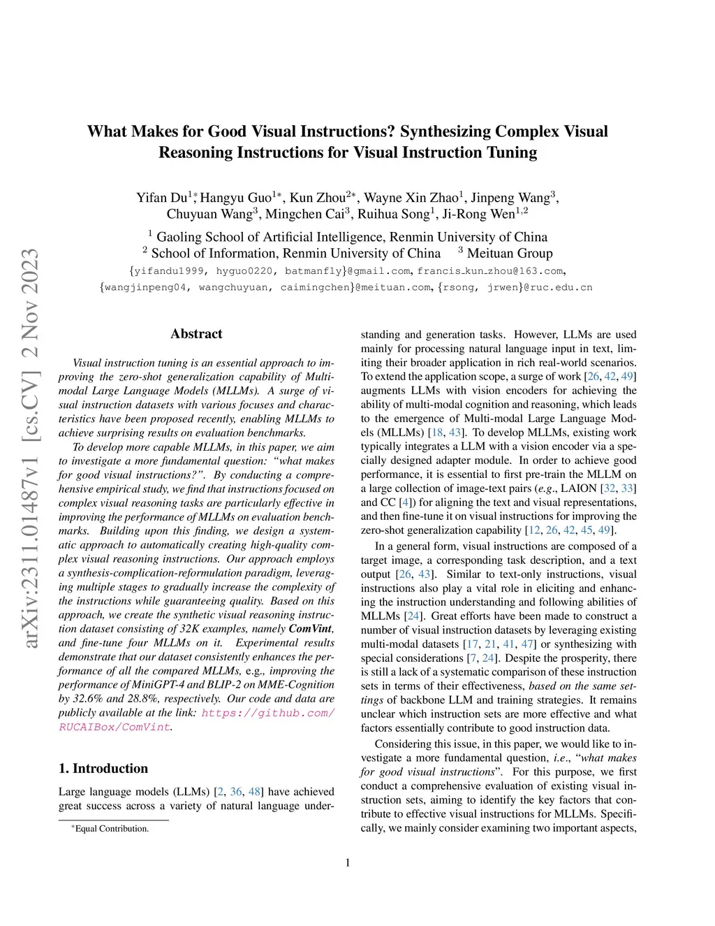 Visual instruction tuning is crucial for enhancing the zero-shot generalization capability of Multi-modal Large Language Models (MLLMs). In this paper, we aim to investigate a fundamental question: ''what makes for good visual instructions''. Through a comprehensive empirical study, we find that instructions focusing on complex visual reasoning tasks are particularly effective in improving the performance of MLLMs, with results correlating to instruction complexity. Based on this insight, we develop a systematic approach to automatically create high-quality complex visual reasoning instructions. Our approach employs a synthesize-complicate-reformulate paradigm, leveraging multiple stages to gradually increase the complexity of the instructions while guaranteeing quality. Based on this approach, we create the ComVint dataset with 32K examples, and fine-tune four MLLMs on it. Experimental results consistently demonstrate the enhanced performance of all compared MLLMs, such as a 27.86% and 27.60% improvement for LLaVA on MME-Perception and MME-Cognition, respectively. Our code and data are publicly available at the link:this https URL.