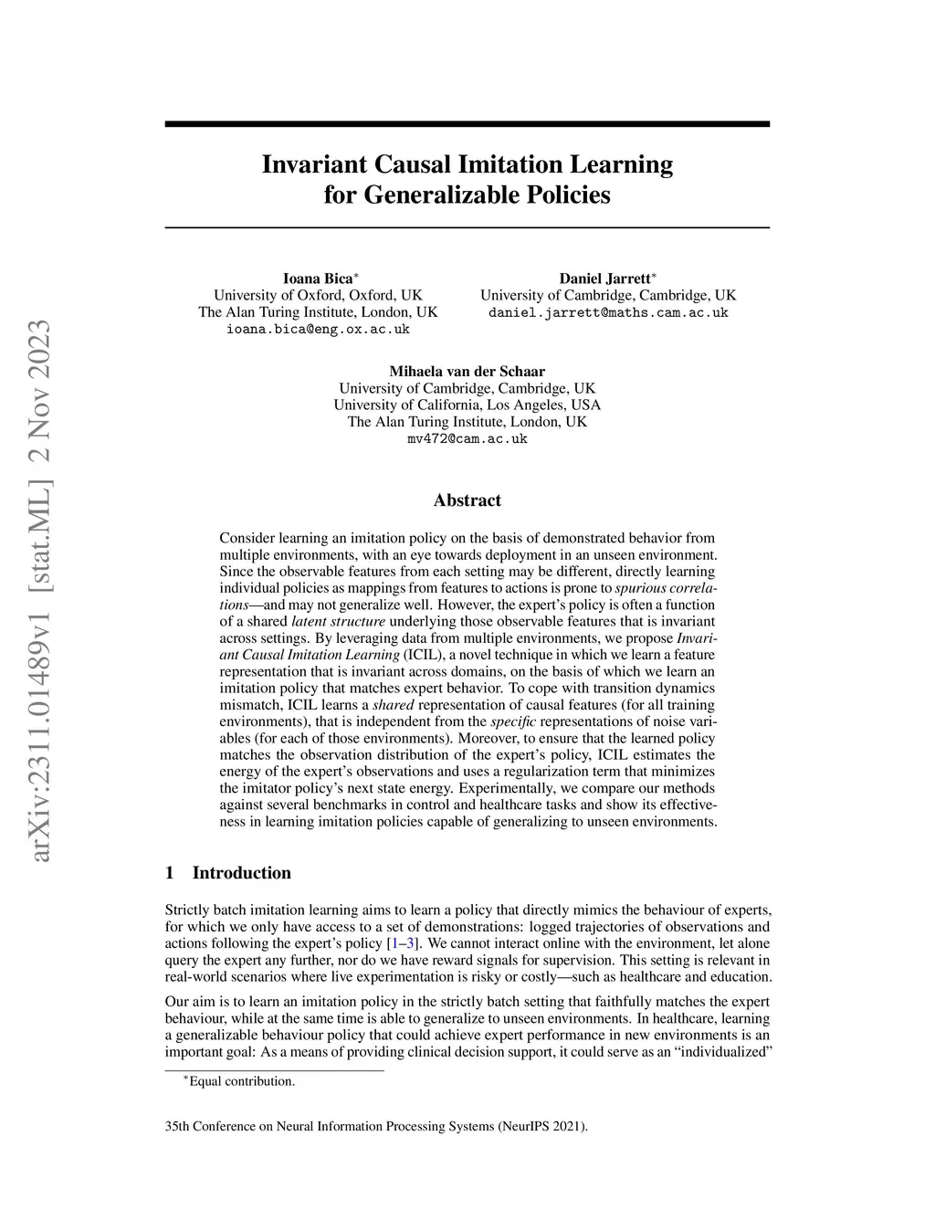 Invariant Causal Imitation Learning for Generalizable Policies