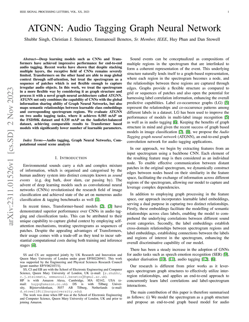 Deep learning models such as CNNs and Transformers have achieved impressive performance for end-to-end audio tagging. Recent works have shown that despite stacking multiple layers, the receptive field of CNNs remains severely limited. Transformers on the other hand are able to map global context through self-attention, but treat the spectrogram as a sequence of patches which is not flexible enough to capture irregular audio objects. In this work, we treat the spectrogram in a more flexible way by considering it as graph structure and process it with a novel graph neural architecture called ATGNN. ATGNN not only combines the capability of CNNs with the global information sharing ability of Graph Neural Networks, but also maps semantic relationships between learnable class embeddings and corresponding spectrogram regions. We evaluate ATGNN on two audio tagging tasks, where it achieves 0.585 mAP on the FSD50K dataset and 0.335 mAP on the AudioSet-balanced dataset, achieving comparable results to Transformer based models with significantly lower number of learnable parameters.