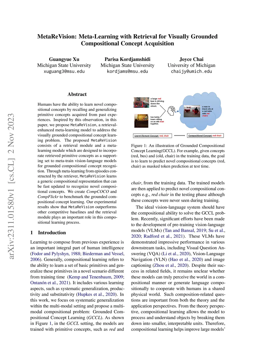 Humans have the ability to learn novel compositional concepts by recalling and generalizing primitive concepts acquired from past experiences. Inspired by this observation, in this paper, we propose MetaReVision, a retrieval-enhanced meta-learning model to address the visually grounded compositional concept learning problem. The proposed MetaReVision consists of a retrieval module and a meta-learning module which are designed to incorporate retrieved primitive concepts as a supporting set to meta-train vision-anguage models for grounded compositional concept recognition. Through meta-learning from episodes constructed by the retriever, MetaReVision learns a generic compositional representation that can be fast updated to recognize novel compositional concepts. We create CompCOCO and CompFlickr to benchmark the grounded compositional concept learning. Our experimental results show that MetaReVision outperforms other competitive baselines and the retrieval module plays an important role in this compositional learning process.
