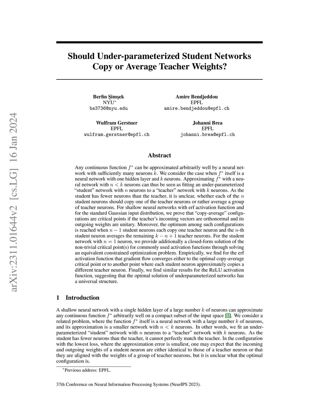 Any continuous function can be approximated arbitrarily well by a neural network with sufficiently many neurons . We consider the case when itself is a neural network with one hidden layer and neurons. Approximating with a neural network with neurons can thus be seen as fitting an under-parameterized "student" network with neurons to a "teacher" network with neurons. As the student has fewer neurons than the teacher, it is unclear, whether each of the student neurons should copy one of the teacher neurons or rather average a group of teacher neurons. For shallow neural networks with erf activation function and for the standard Gaussian input distribution, we prove that "copy-average" configurations are critical points if the teacher's incoming vectors are orthonormal and its outgoing weights are unitary. Moreover, the optimum among such configurations is reached when student neurons each copy one teacher neuron and the -th student neuron averages the remaining teacher neurons. For the student network with neuron, we provide additionally a closed-form solution of the non-trivial critical point(s) for commonly used activation functions through solving an equivalent constrained optimization problem. Empirically, we find for the erf activation function that gradient flow converges either to the optimal copy-average critical point or to another point where each student neuron approximately copies a different teacher neuron. Finally, we find similar results for the ReLU activation function, suggesting that the optimal solution of underparameterized networks has a universal structure.