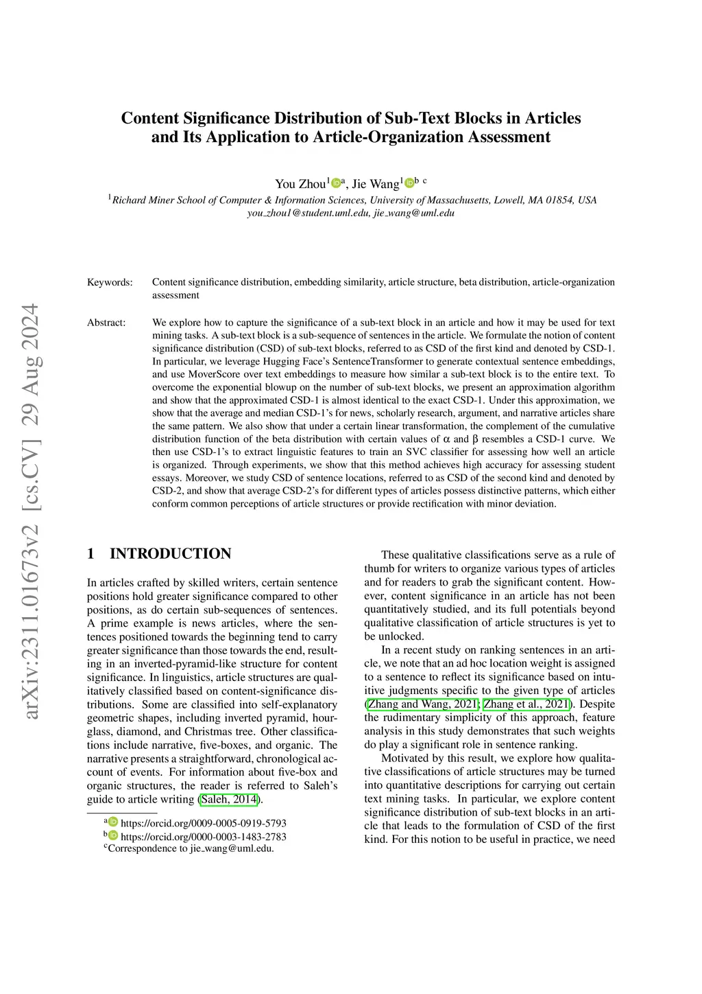 We explore how to capture the significance of a sub-text block in an article and how it may be used for text mining tasks. A sub-text block is a sub-sequence of sentences in the article. We formulate the notion of content significance distribution (CSD) of sub-text blocks, referred to as CSD of the first kind and denoted by CSD-1. In particular, we leverage Hugging Face's SentenceTransformer to generate contextual sentence embeddings, and use MoverScore over text embeddings to measure how similar a sub-text block is to the entire text. To overcome the exponential blowup on the number of sub-text blocks, we present an approximation algorithm and show that the approximated CSD-1 is almost identical to the exact CSD-1. Under this approximation, we show that the average and median CSD-1's for news, scholarly research, argument, and narrative articles share the same pattern. We also show that under a certain linear transformation, the complement of the cumulative distribution function of the beta distribution with certain values of and resembles a CSD-1 curve. We then use CSD-1's to extract linguistic features to train an SVC classifier for assessing how well an article is organized. Through experiments, we show that this method achieves high accuracy for assessing student essays. Moreover, we study CSD of sentence locations, referred to as CSD of the second kind and denoted by CSD-2, and show that average CSD-2's for different types of articles possess distinctive patterns, which either conform common perceptions of article structures or provide rectification with minor deviation.