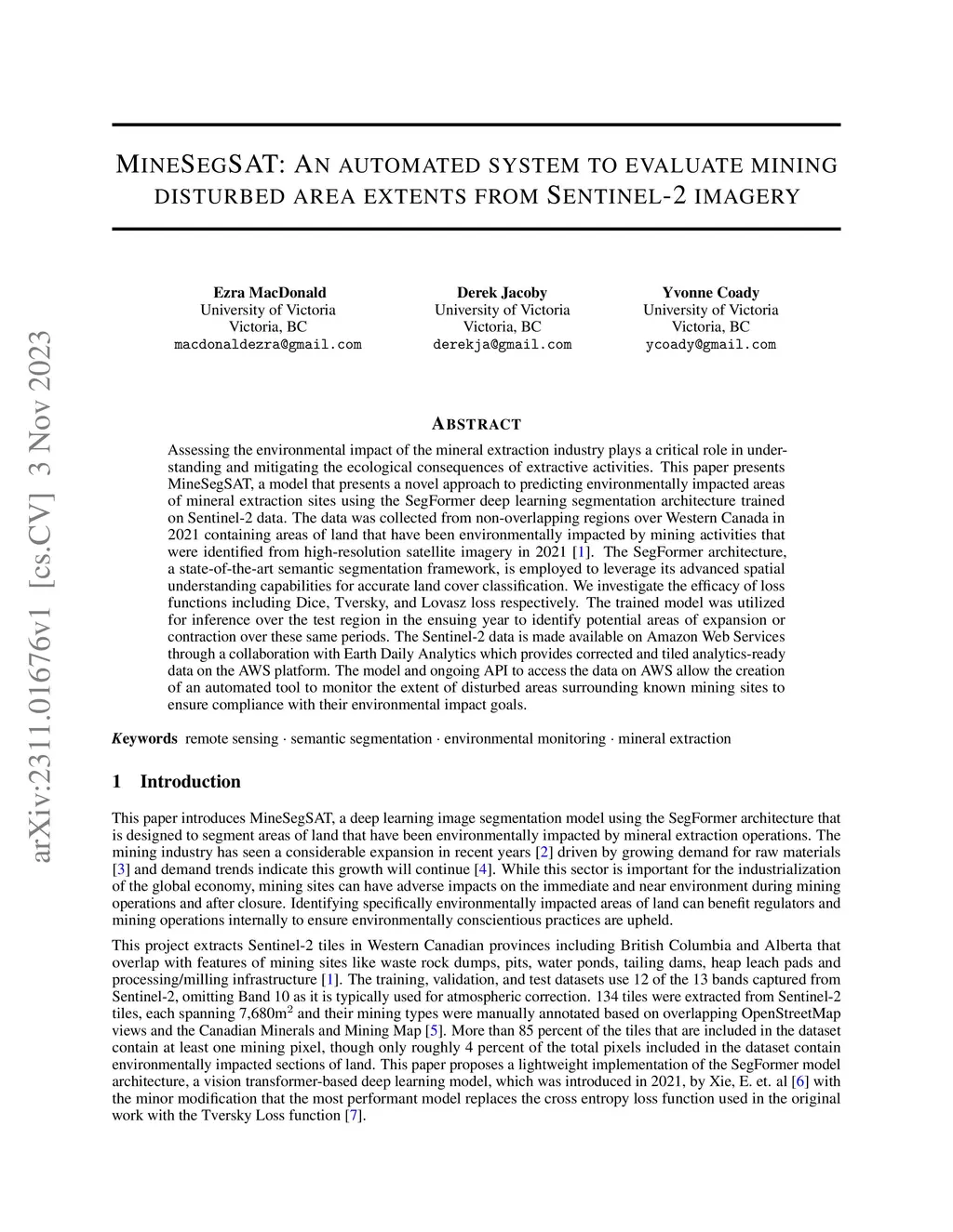 Assessing the environmental impact of the mineral extraction industry plays a critical role in understanding and mitigating the ecological consequences of extractive activities. This paper presents MineSegSAT, a model that presents a novel approach to predicting environmentally impacted areas of mineral extraction sites using the SegFormer deep learning segmentation architecture trained on Sentinel-2 data. The data was collected from non-overlapping regions over Western Canada in 2021 containing areas of land that have been environmentally impacted by mining activities that were identified from high-resolution satellite imagery in 2021. The SegFormer architecture, a state-of-the-art semantic segmentation framework, is employed to leverage its advanced spatial understanding capabilities for accurate land cover classification. We investigate the efficacy of loss functions including Dice, Tversky, and Lovasz loss respectively. The trained model was utilized for inference over the test region in the ensuing year to identify potential areas of expansion or contraction over these same periods. The Sentinel-2 data is made available on Amazon Web Services through a collaboration with Earth Daily Analytics which provides corrected and tiled analytics-ready data on the AWS platform. The model and ongoing API to access the data on AWS allow the creation of an automated tool to monitor the extent of disturbed areas surrounding known mining sites to ensure compliance with their environmental impact goals.