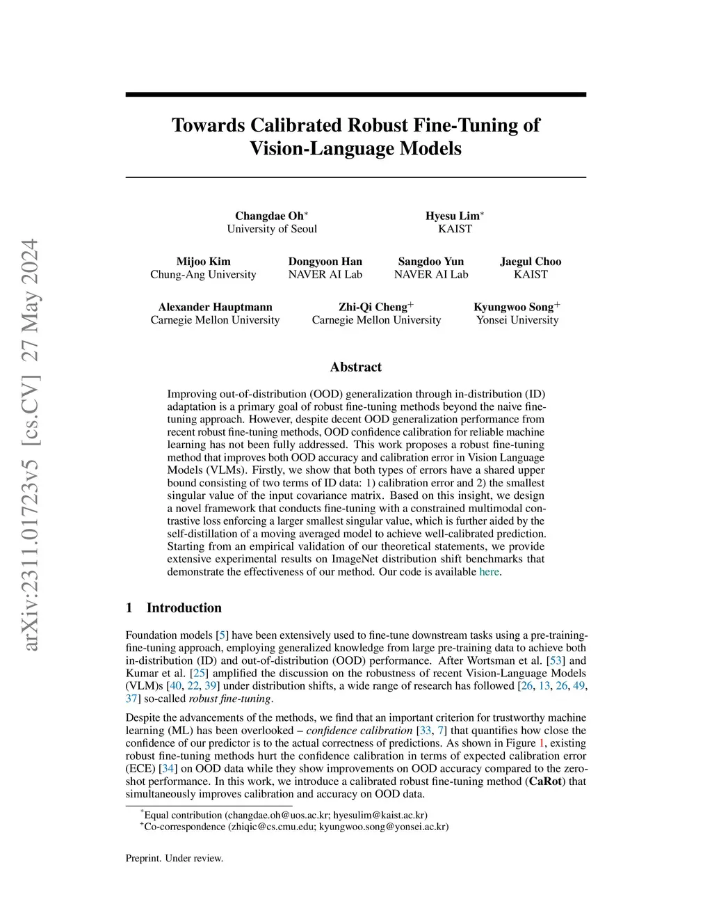 Improving out-of-distribution (OOD) generalization through in-distribution (ID) adaptation is a primary goal of robust fine-tuning methods beyond the naive fine-tuning approach. However, despite decent OOD generalization performance from recent robust fine-tuning methods, OOD confidence calibration for reliable machine learning has not been fully addressed. This work proposes a robust fine-tuning method that improves both OOD accuracy and calibration error in Vision Language Models (VLMs). Firstly, we show that both types of errors have a shared upper bound consisting of two terms of ID data: 1) calibration error and 2) the smallest singular value of the input covariance matrix. Based on this insight, we design a novel framework that conducts fine-tuning with a constrained multimodal contrastive loss enforcing a larger smallest singular value, which is further aided by the self-distillation of a moving averaged model to achieve well-calibrated prediction. Starting from an empirical validation of our theoretical statements, we provide extensive experimental results on ImageNet distribution shift benchmarks that demonstrate the effectiveness of our method.