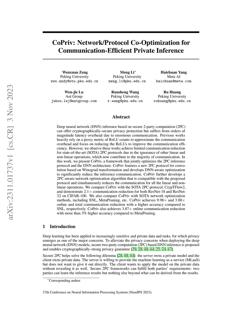 Deep neural network (DNN) inference based on secure 2-party computation (2PC) can offer cryptographically-secure privacy protection but suffers from orders of magnitude latency overhead due to enormous communication. Previous works heavily rely on a proxy metric of ReLU counts to approximate the communication overhead and focus on reducing the ReLUs to improve the communication efficiency. However, we observe these works achieve limited communication reduction for state-of-the-art (SOTA) 2PC protocols due to the ignorance of other linear and non-linear operations, which now contribute to the majority of communication. In this work, we present CoPriv, a framework that jointly optimizes the 2PC inference protocol and the DNN architecture. CoPriv features a new 2PC protocol for convolution based on Winograd transformation and develops DNN-aware optimization to significantly reduce the inference communication. CoPriv further develops a 2PC-aware network optimization algorithm that is compatible with the proposed protocol and simultaneously reduces the communication for all the linear and non-linear operations. We compare CoPriv with the SOTA 2PC protocol, CrypTFlow2, and demonstrate 2.1x communication reduction for both ResNet-18 and ResNet-32 on CIFAR-100. We also compare CoPriv with SOTA network optimization methods, including SNL, MetaPruning, etc. CoPriv achieves 9.98x and 3.88x online and total communication reduction with a higher accuracy compare to SNL, respectively. CoPriv also achieves 3.87x online communication reduction with more than 3% higher accuracy compared to MetaPruning.
